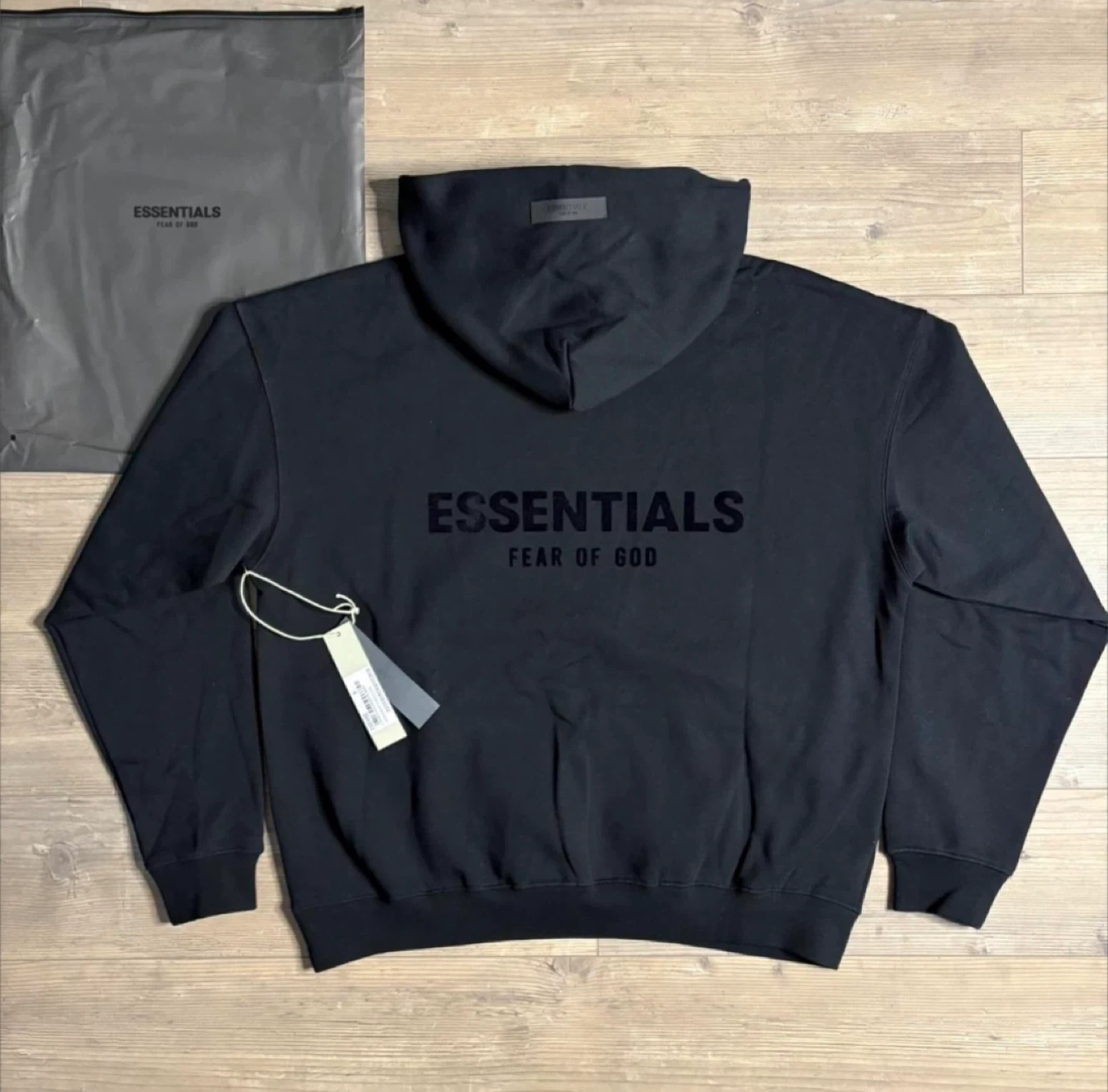 This is a black Fear of God Essentials hoodie. It comes with a front pouch pocket and a drawstring hood. Includes the original branded dust bag.