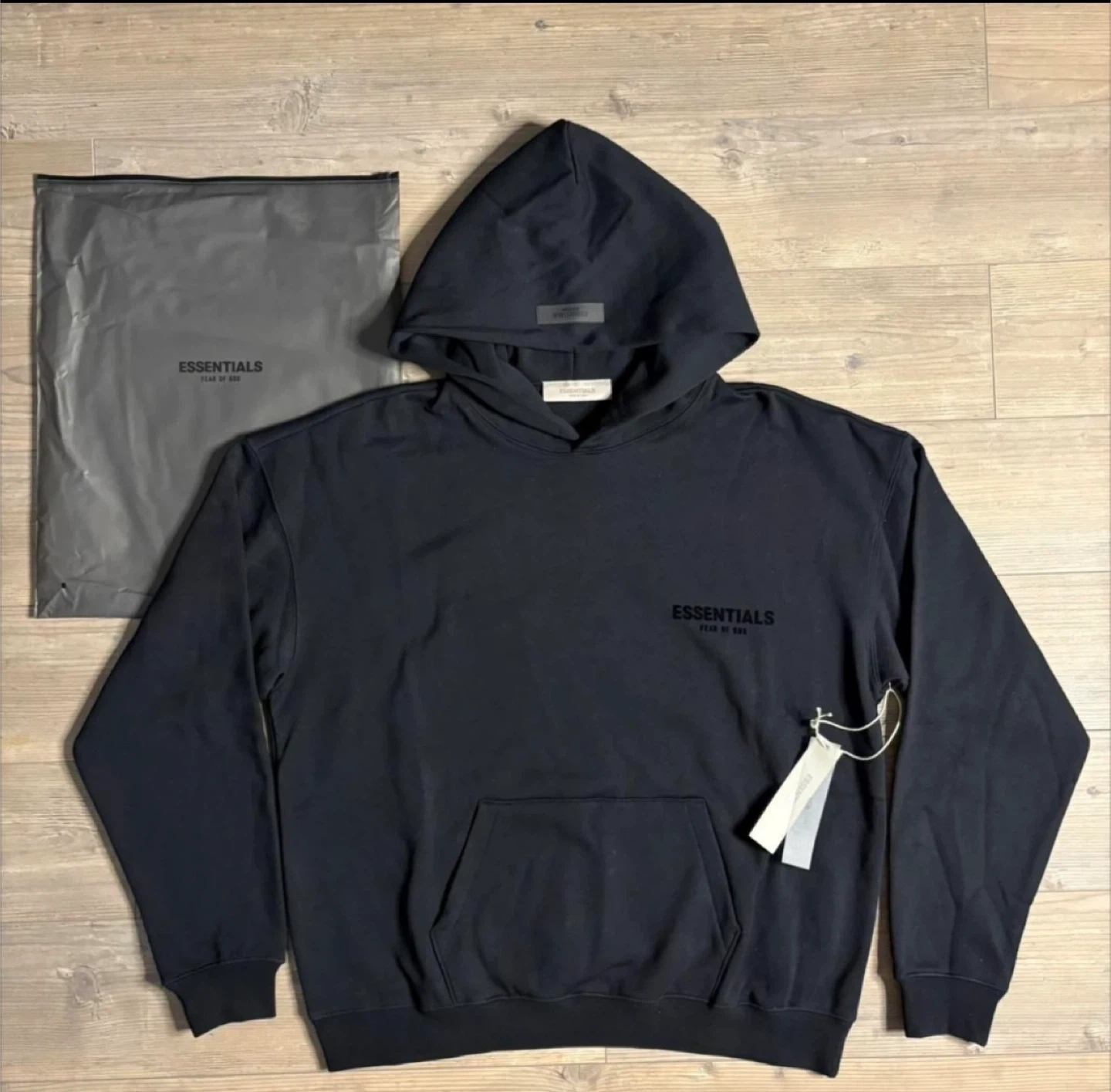 This is a black Fear of God Essentials hoodie. It comes with a front pouch pocket and a drawstring hood. Includes the original branded dust bag.