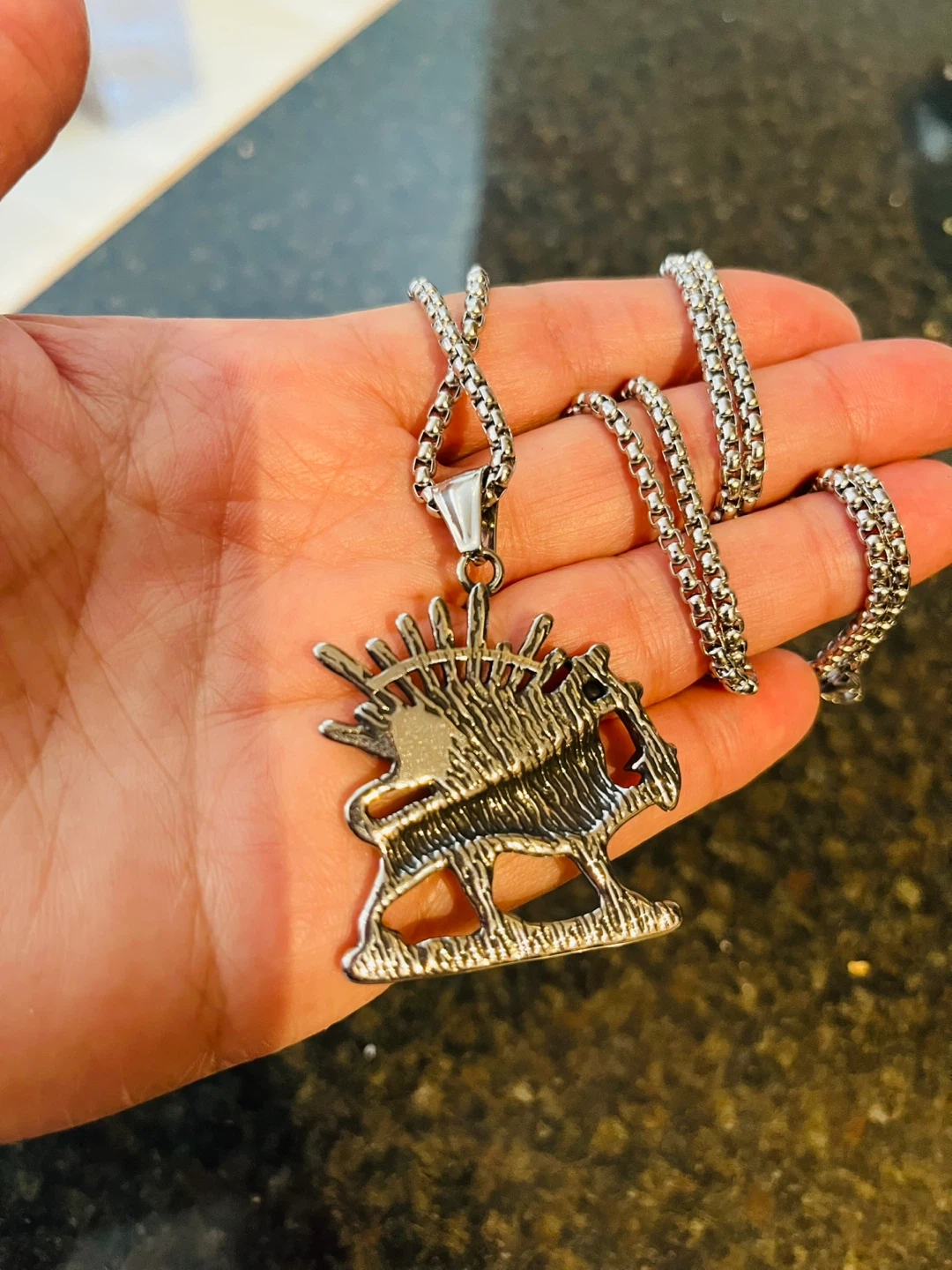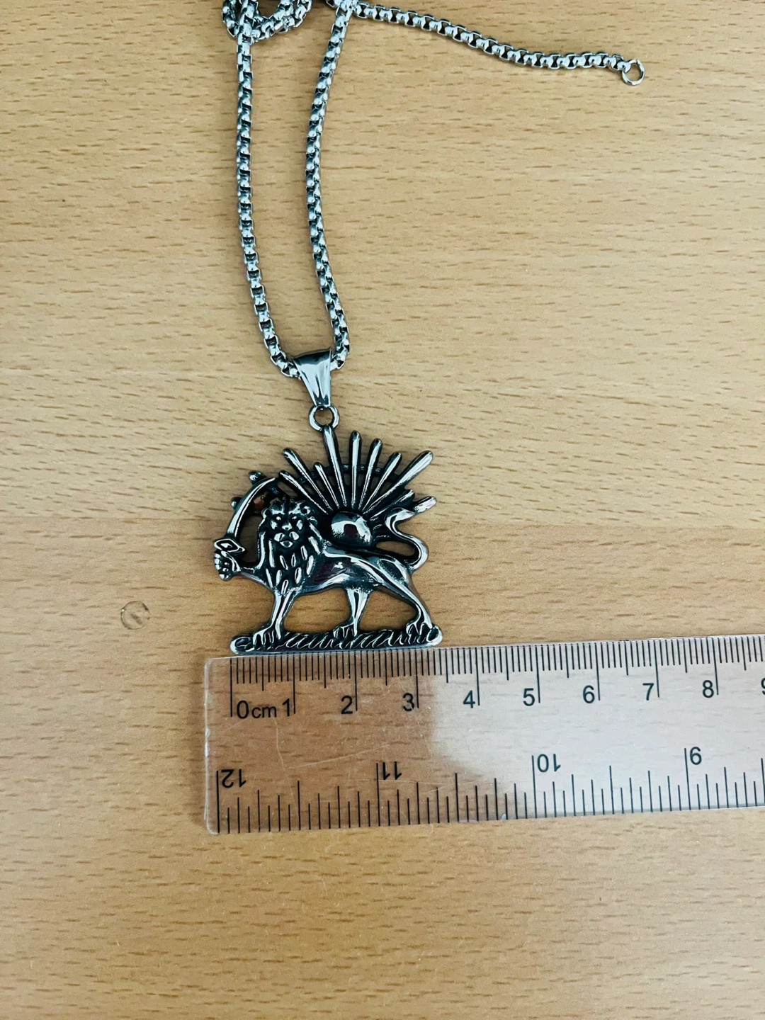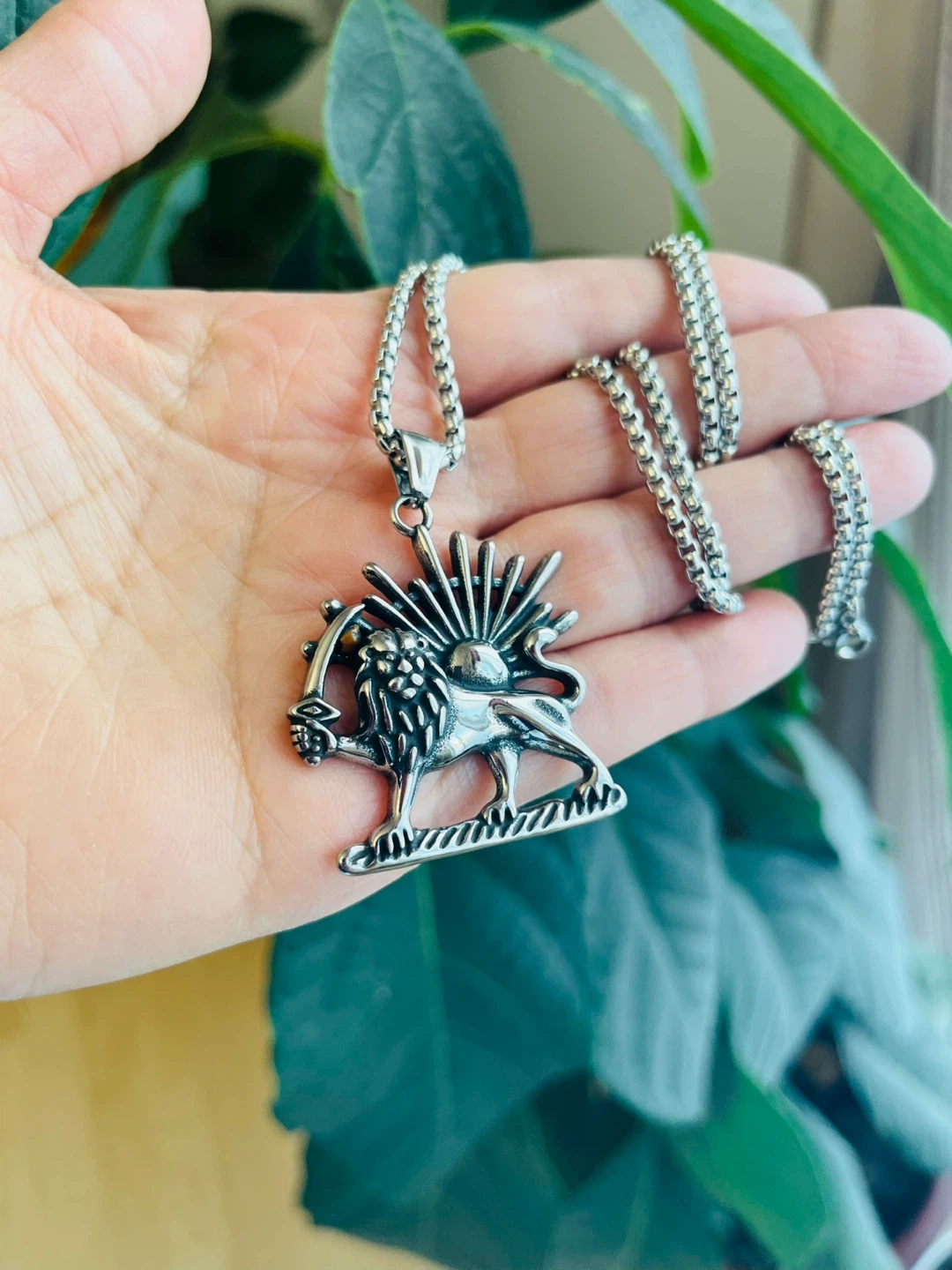 Stainless steel pendant necklace featuring a lion with a sun emblem. The chain measures approximately 24 inches. This necklace is made of stainless steel.