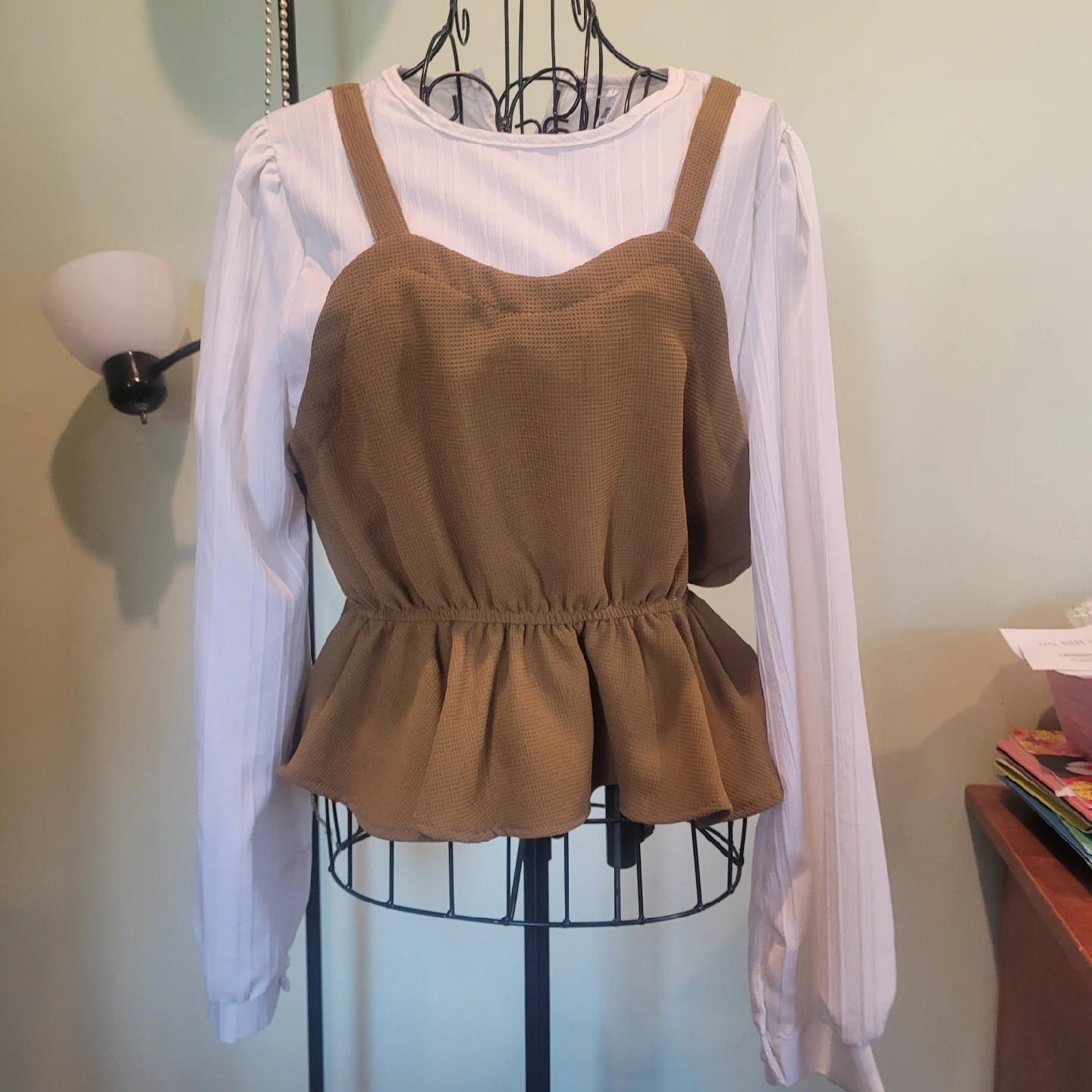 This is a cute brown peplum top with a white long-sleeve shirt underneath. The top is brown with a textured pattern, and the long-sleeve shirt is white with a ribbed design. It's in great condition and ready for a new home!
