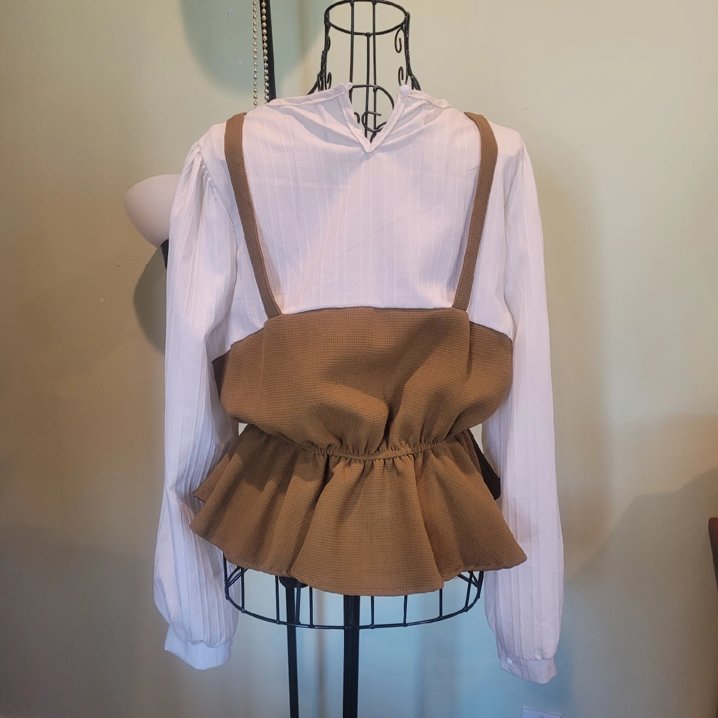 This is a cute brown peplum top with a white long-sleeve shirt underneath. The top is brown with a textured pattern, and the long-sleeve shirt is white with a ribbed design. It's in great condition and ready for a new home!