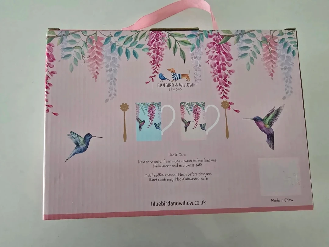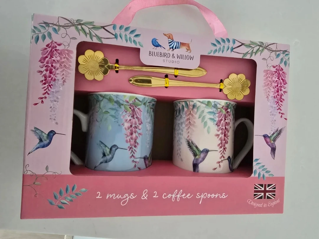 Lovely set featuring two fine bone china mugs with hummingbird and wisteria designs. Includes two matching gold-toned coffee spoons with a floral accent. Dishwasher and microwave safe for the mugs, hand wash only for the spoons.