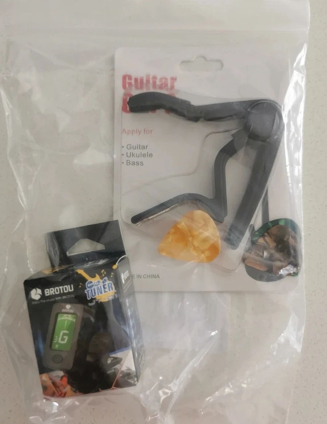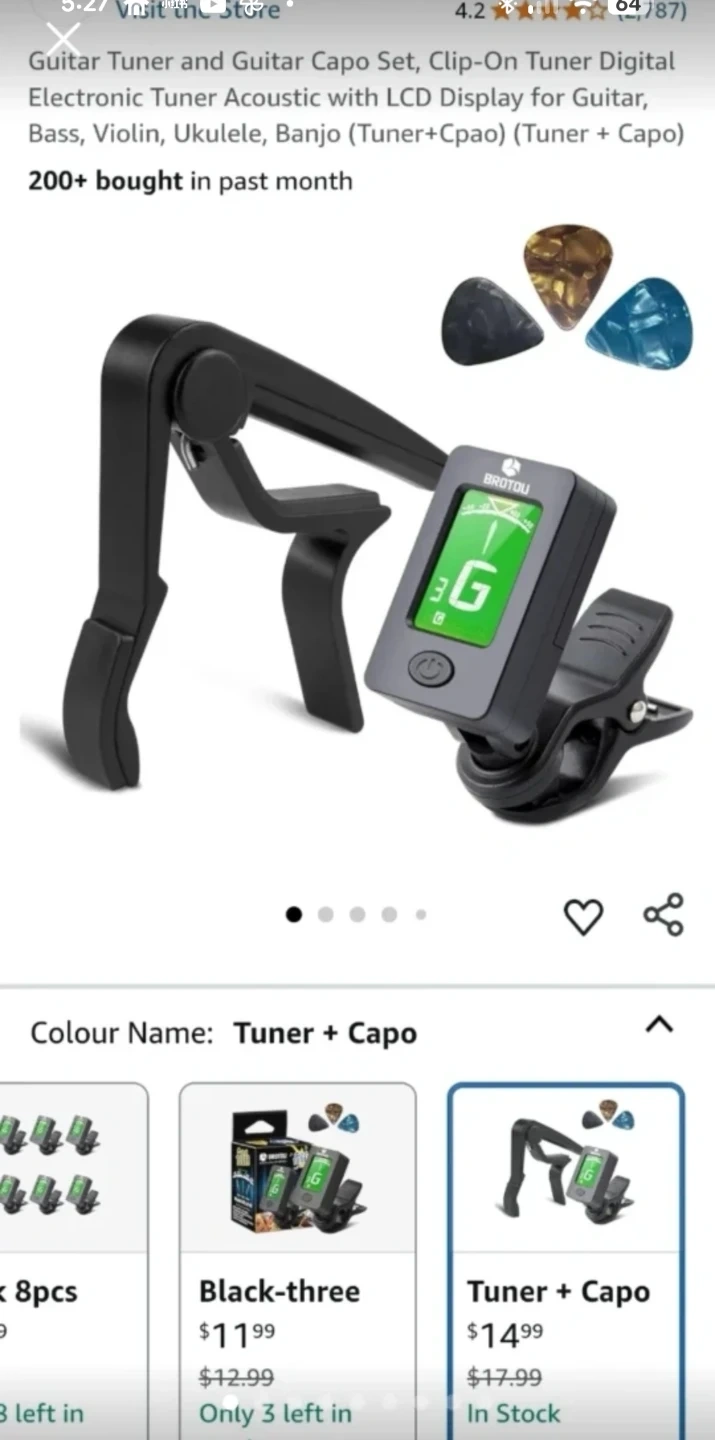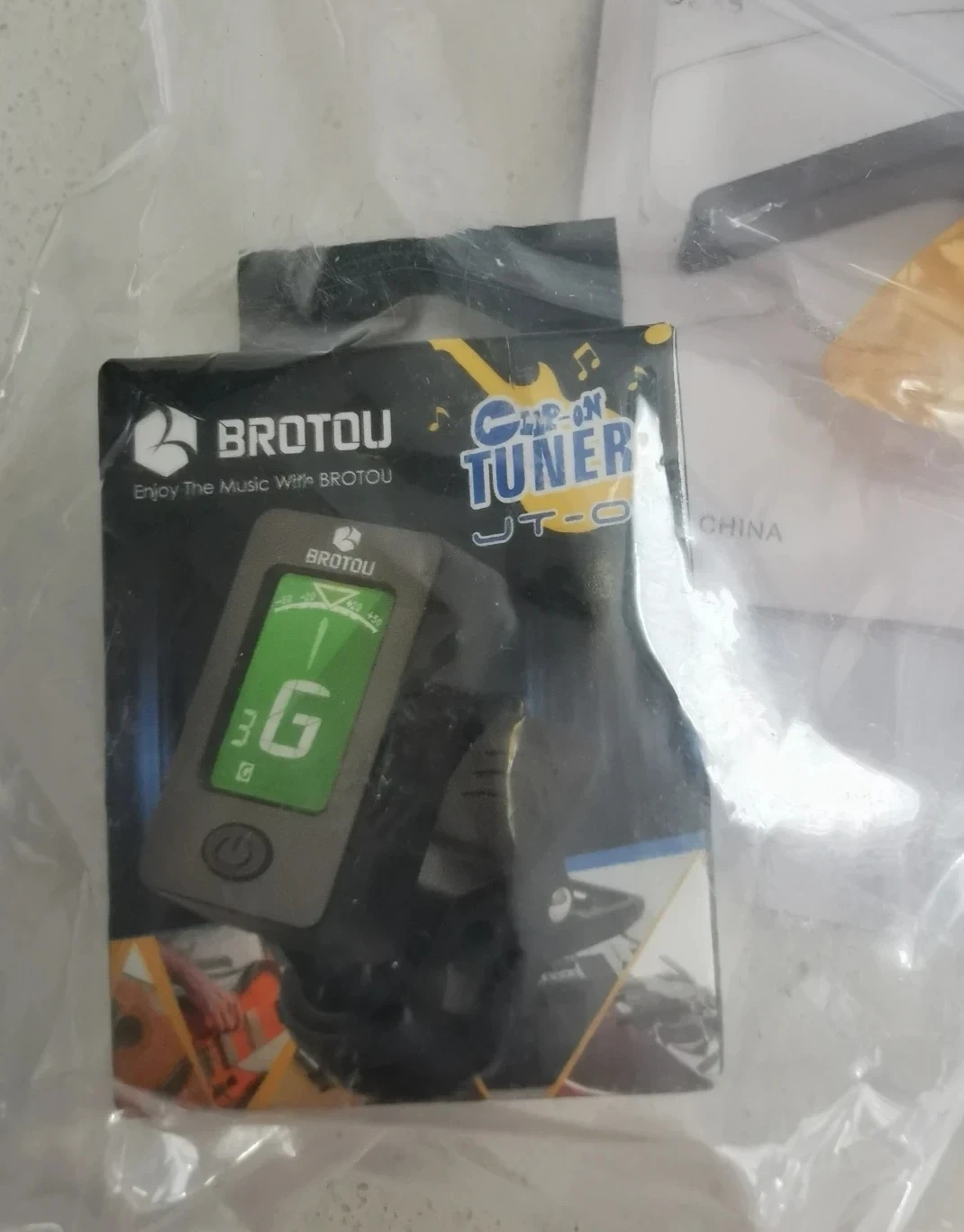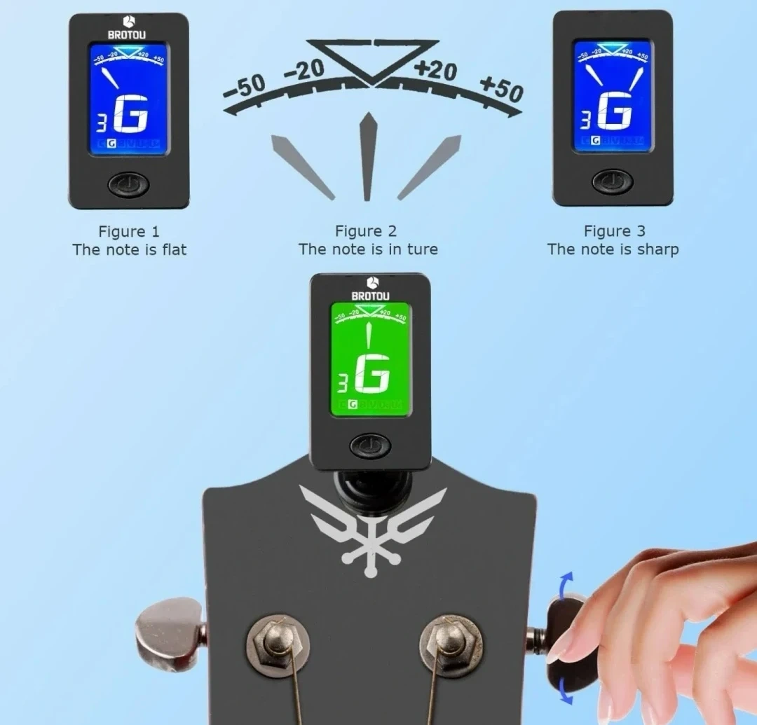 This Brotou clip-on tuner is designed for guitar, bass, violin, and ukulele. It features a 360° rotating head and a 105° rotating display for easy viewing. It can tune to chromatic, guitar, bass, violin, ukulele C, and ukulele D modes.