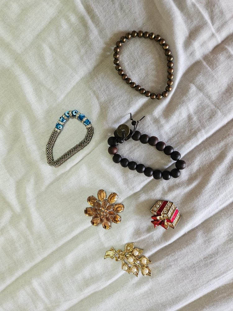 This set includes a bracelet with evil eye charms, a brown bead bracelet, a brown bead necklace, a flower brooch and a gift box brooch and a leaflike brooch