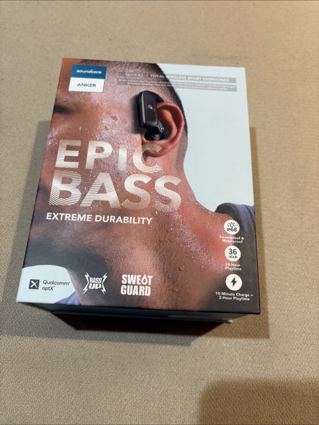 Selling a pair of Soundcore Spirit X2 total wireless sport earphones by Anker. These are sweatproof and waterproof with IP68 rating. Enjoy epic bass and extreme durability! They offer 36-hour playtime, and a quick 10-minute charge gives you 2 hours of playtime. The box is included