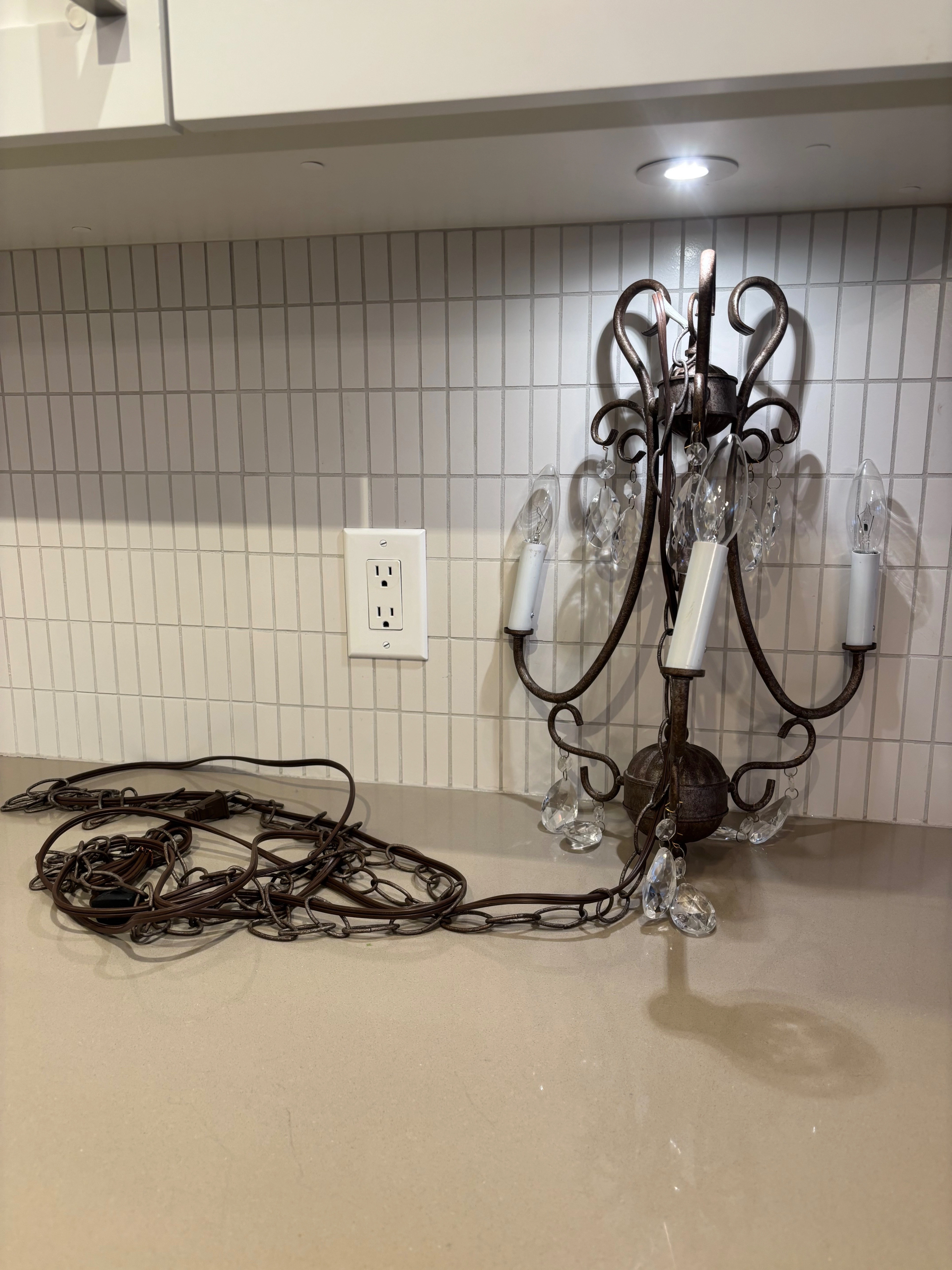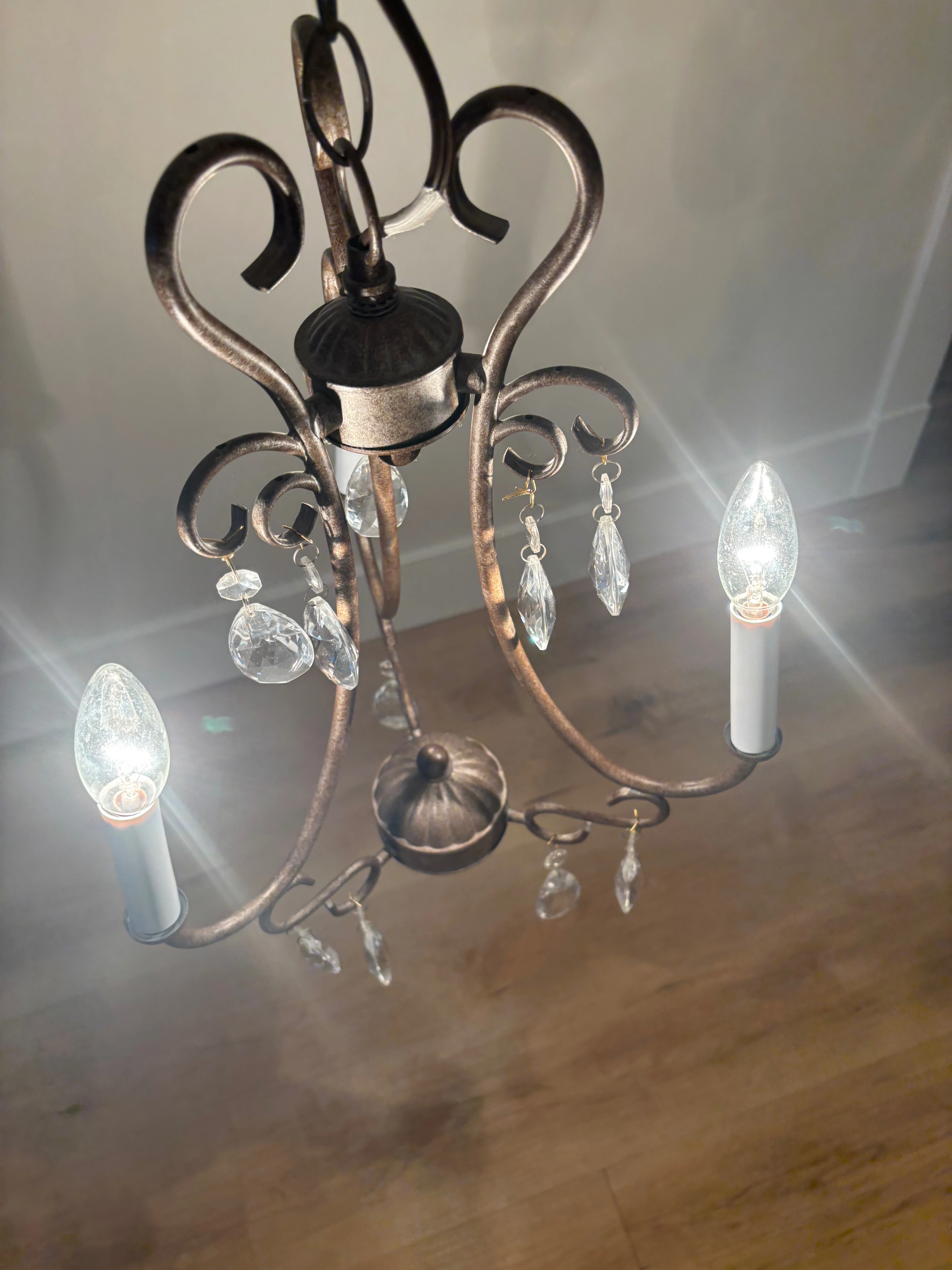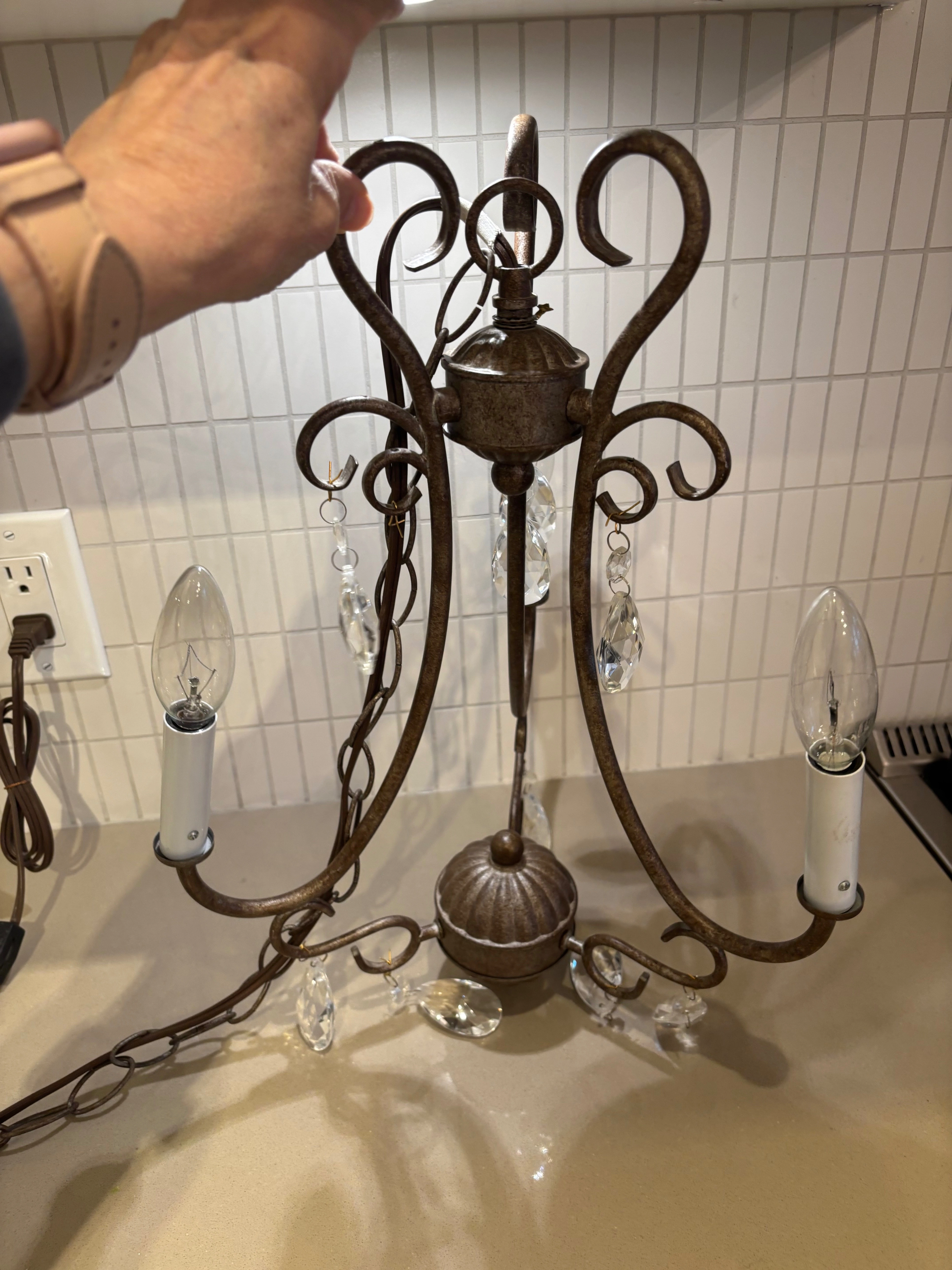 Crystal chandelier, 3 light, plug in & hang anywhere. Extremely long cord. Fixture measures; 18 inches tall & 12 inches wide