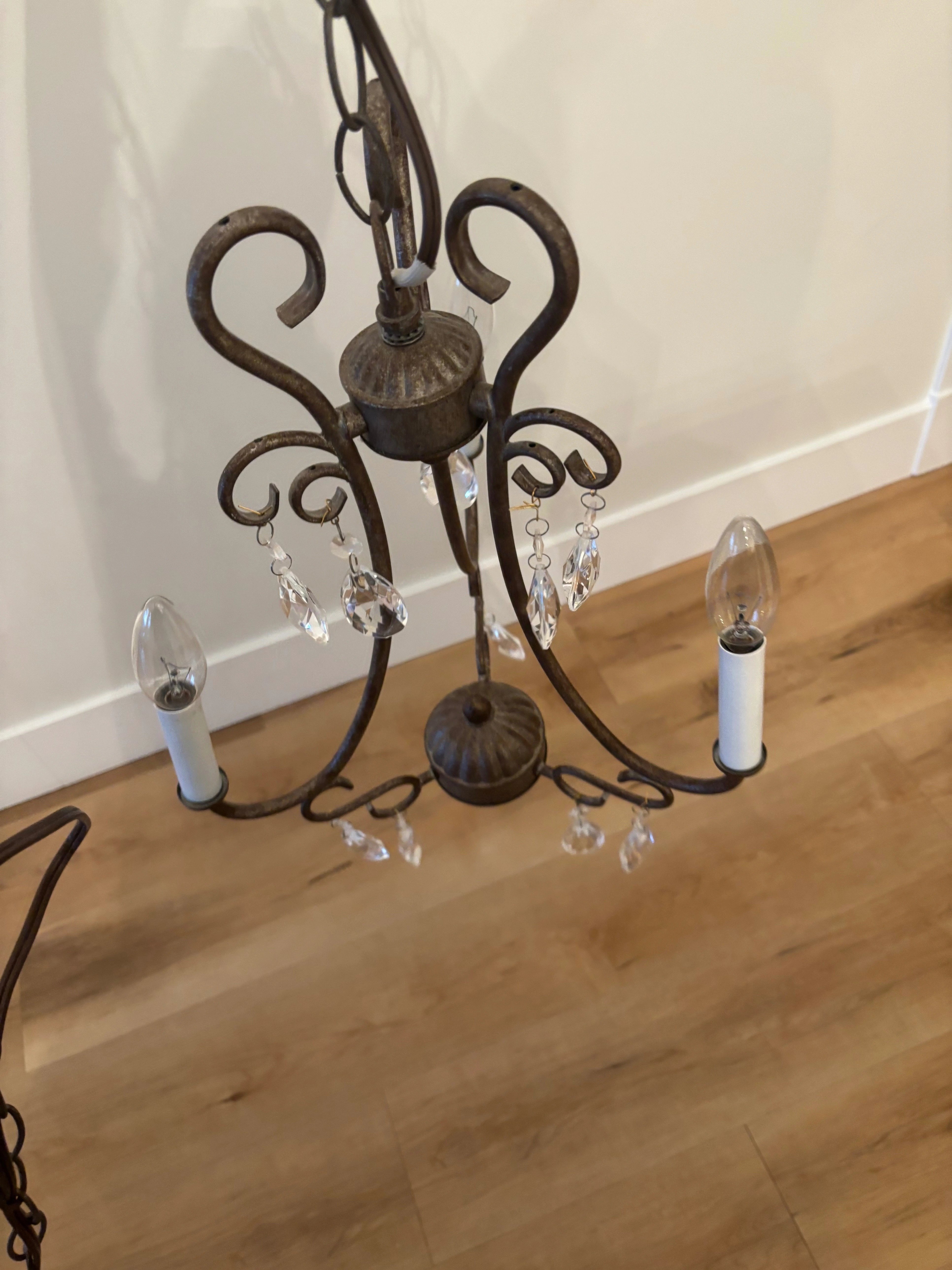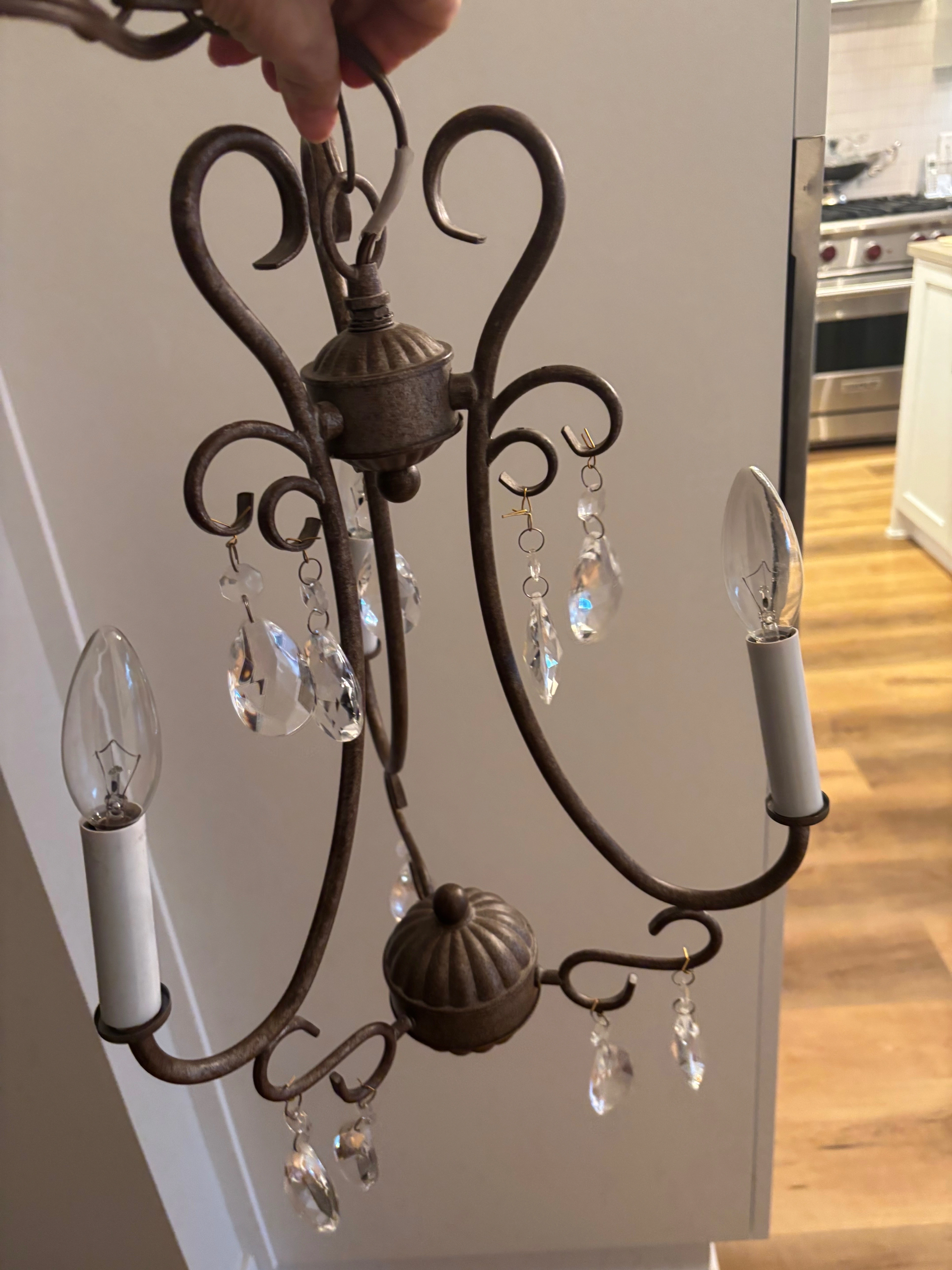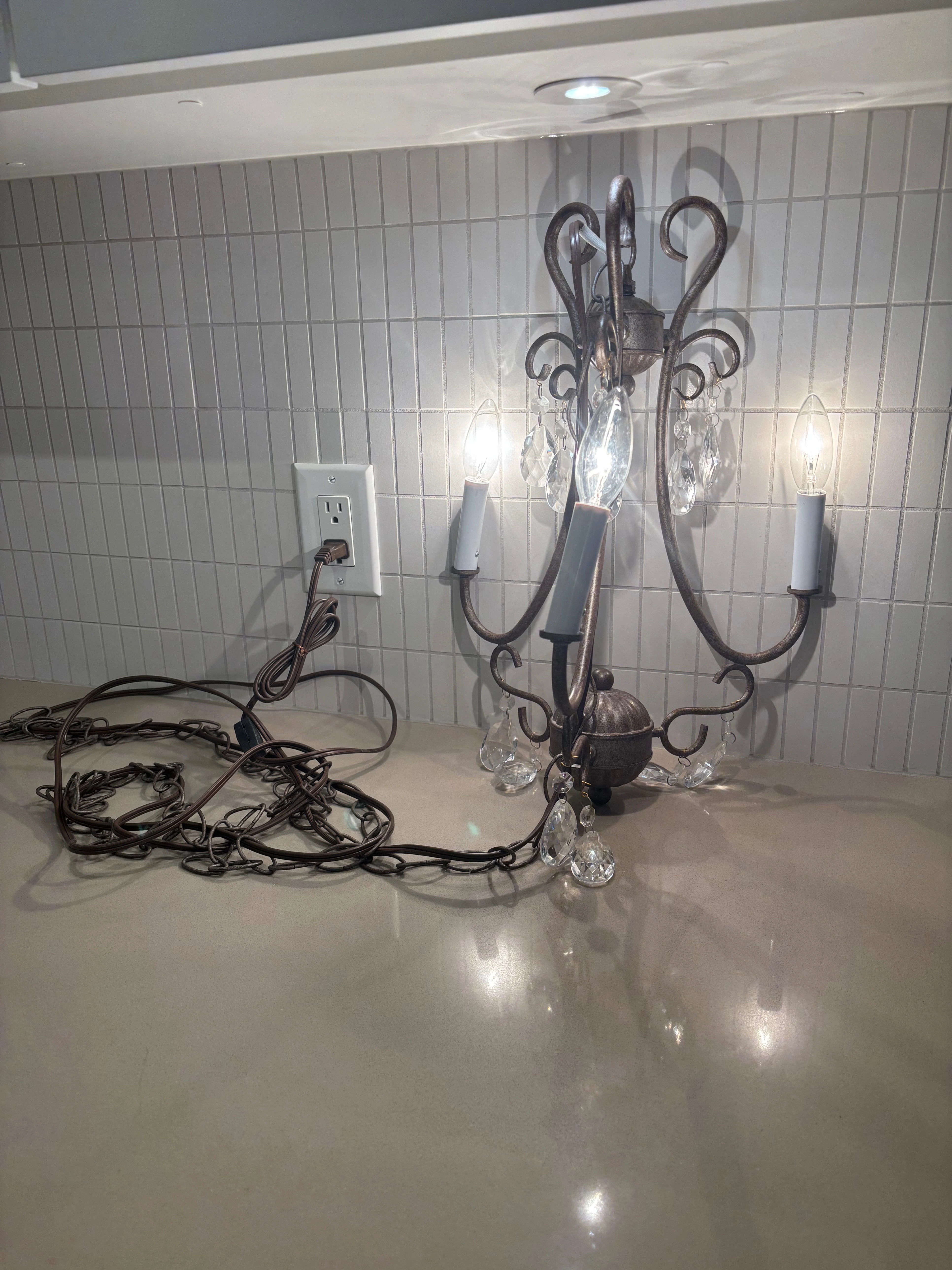 Crystal chandelier, 3 light, plug in & hang anywhere. Extremely long cord. Fixture measures; 18 inches tall & 12 inches wide