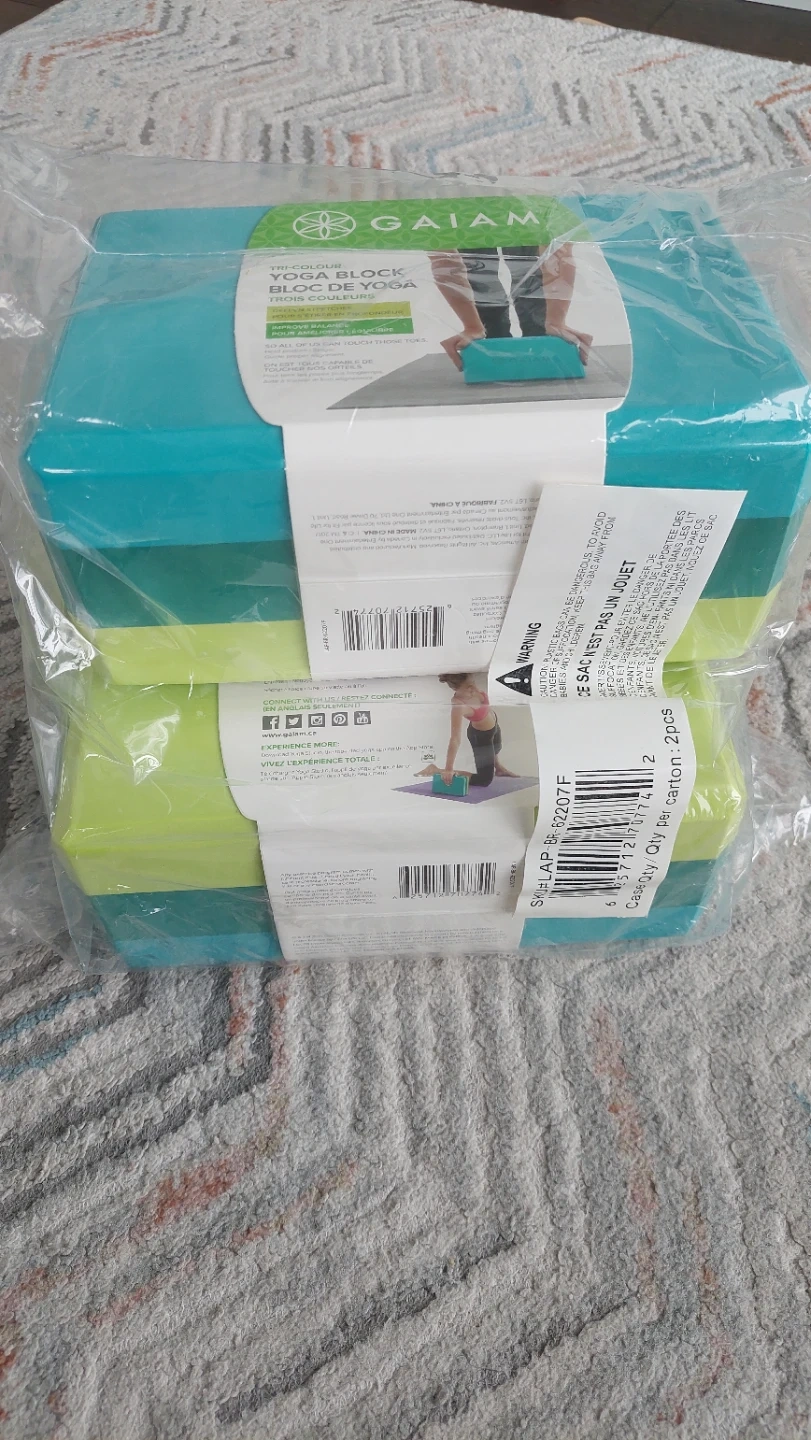 Set of two Gaiam tri-colour yoga blocks. These blocks are designed to improve balance and deepen stretches. Made in China.