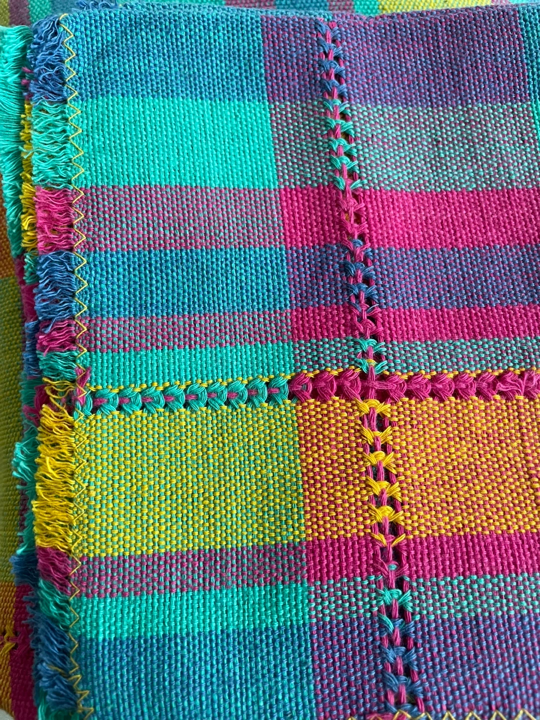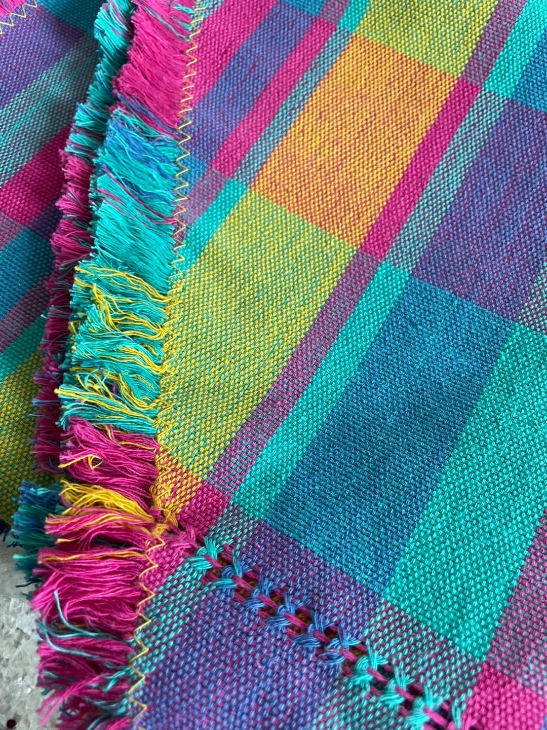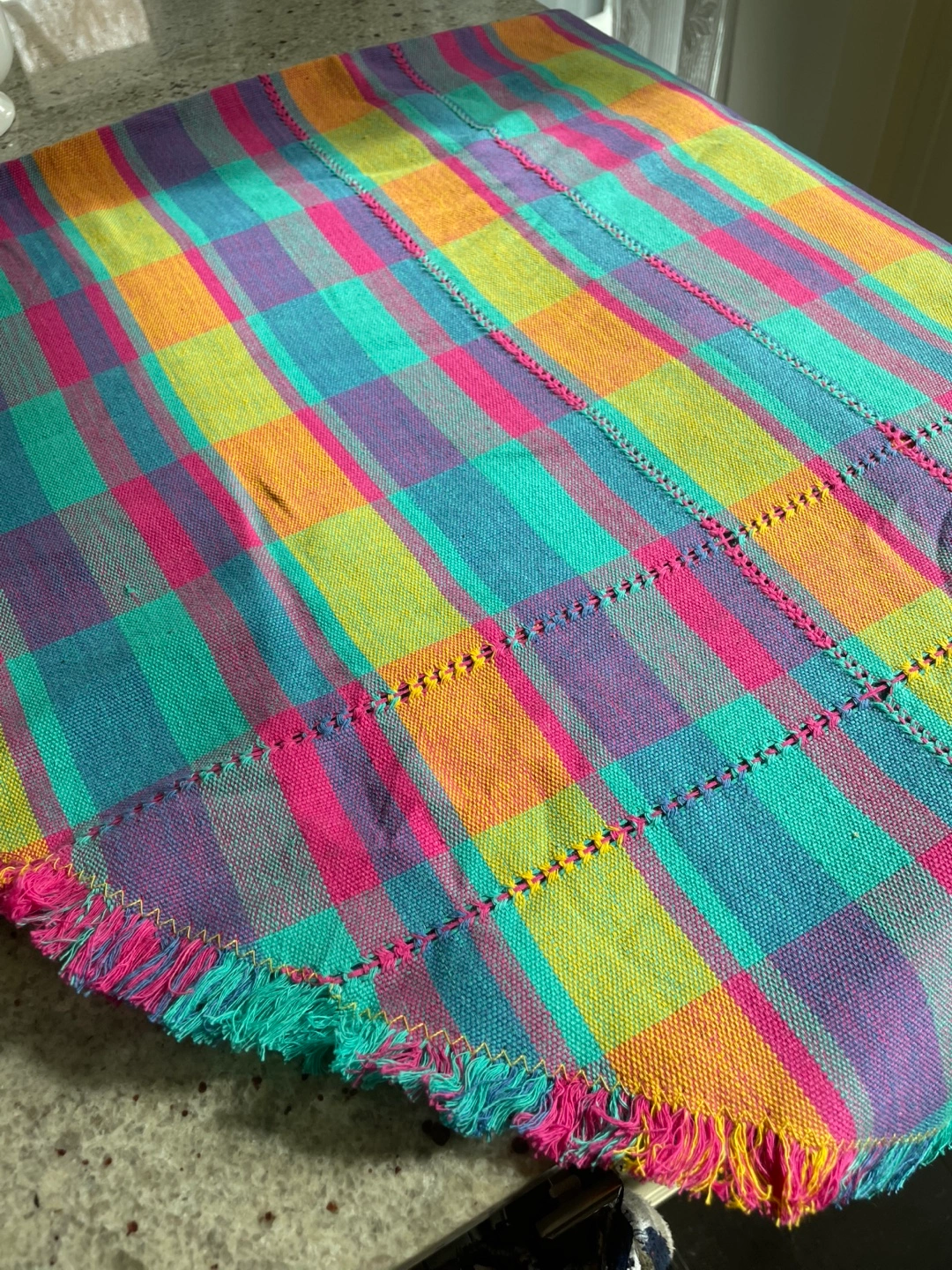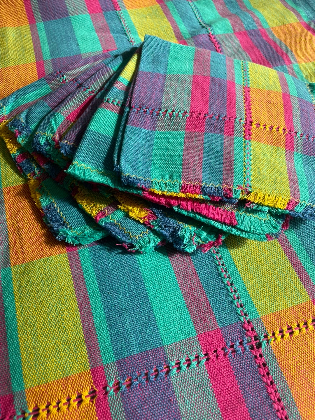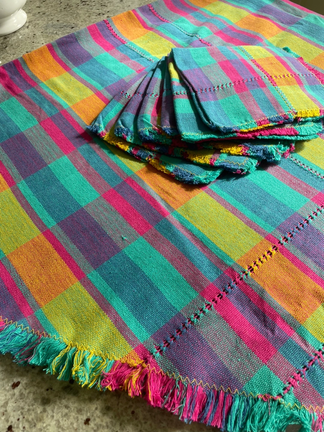 Unique round tablecloth and napkins set (6). Features a colourful plaid pattern in teal, pink, yellow and orange. Napkins and tablecloth have frayed edges. Perfect for adding a pop of colour to your dining table.