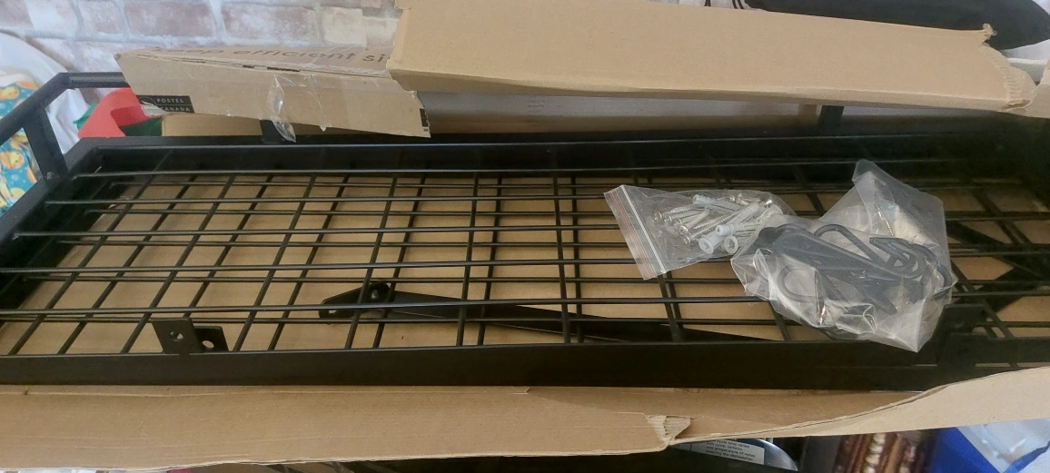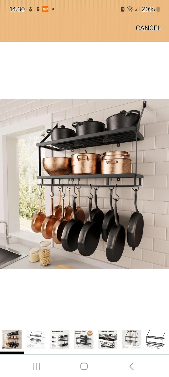 This wall mounted pot rack features a two-tier design with a strong load capacity up to 100 lbs. It includes 12 hooks for hanging pots and pans. The rack is made of durable black metal.