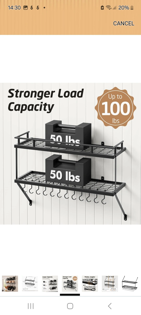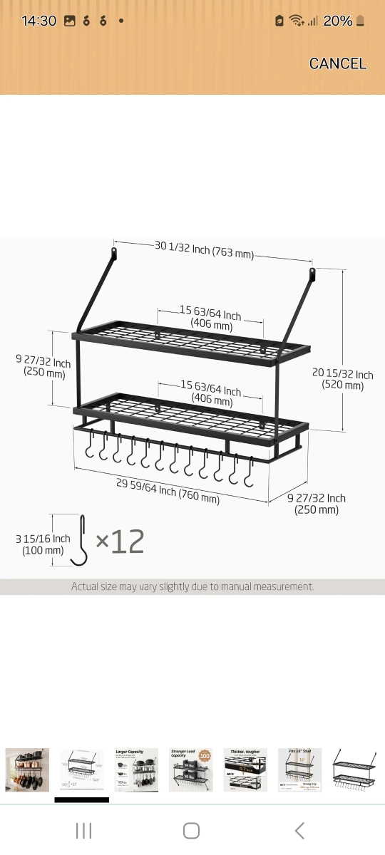 This wall mounted pot rack features a two-tier design with a strong load capacity up to 100 lbs. It includes 12 hooks for hanging pots and pans. The rack is made of durable black metal.