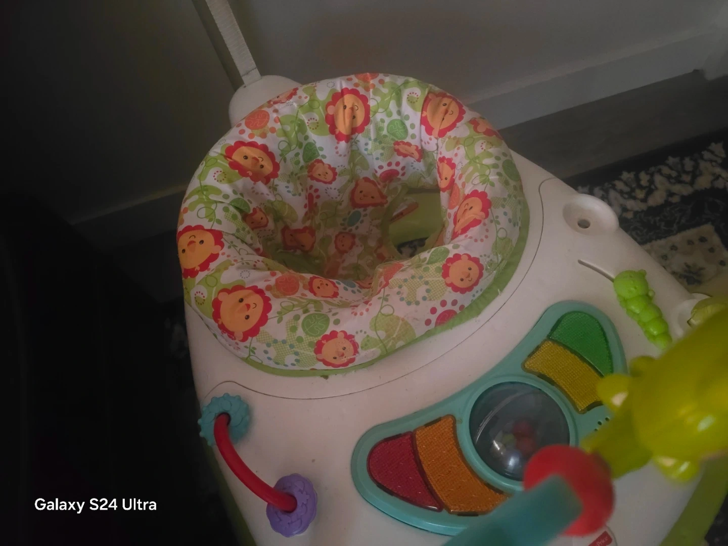 Fisher-Price jumperoo with fun interactive toys and music. It features a comfortable padded seat and a sturdy frame for bouncing fun. Suitable for babies who can hold their head up unassisted.
