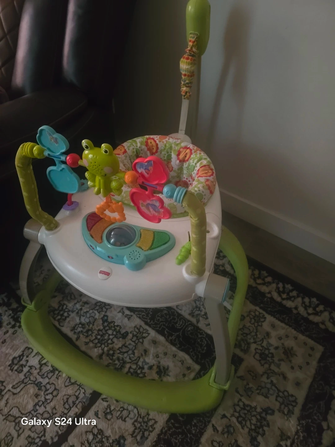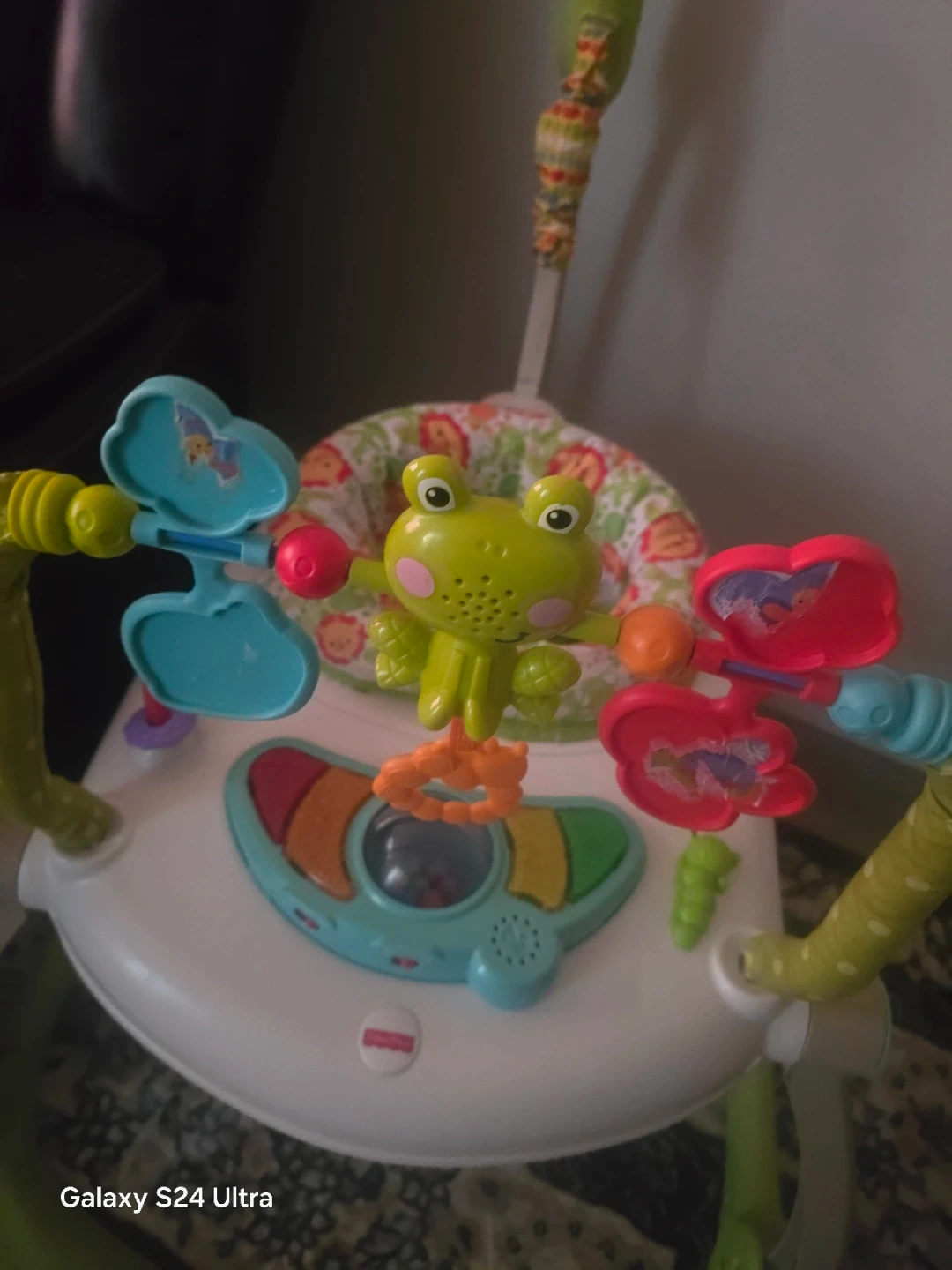 Fisher-Price jumperoo with fun interactive toys and music. It features a comfortable padded seat and a sturdy frame for bouncing fun. Suitable for babies who can hold their head up unassisted.