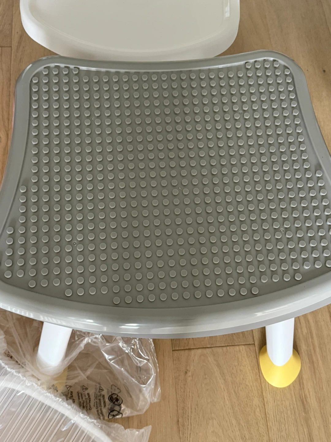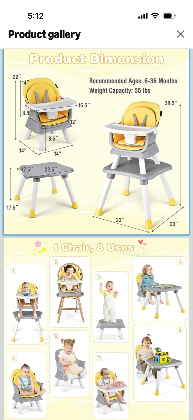 This Babyjoy high chair converts into a play table and chair set. It's suitable for ages 6-36 months with a weight capacity of 55 lbs. Includes seat, tray, and table pieces.