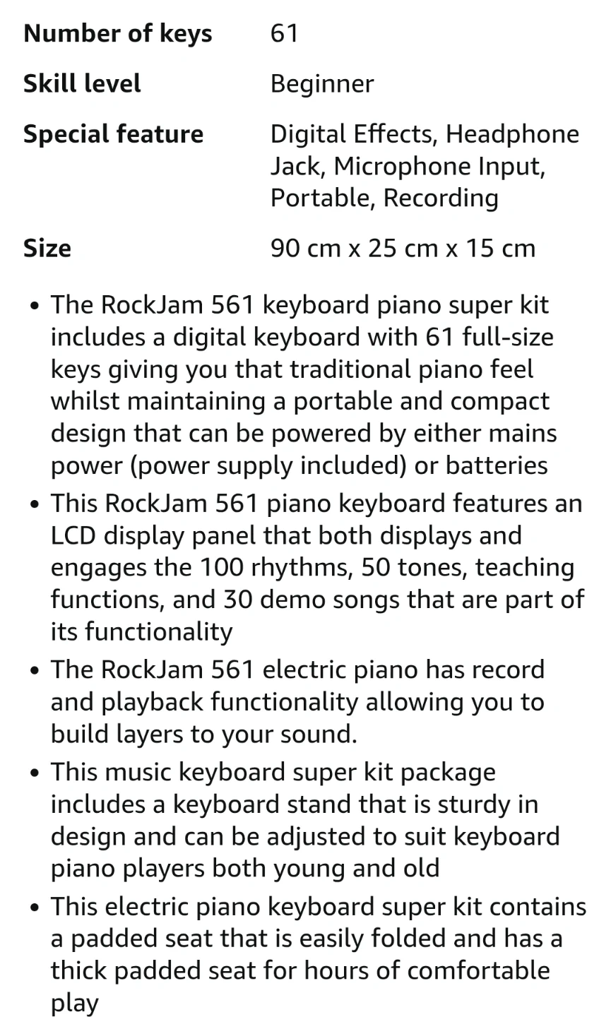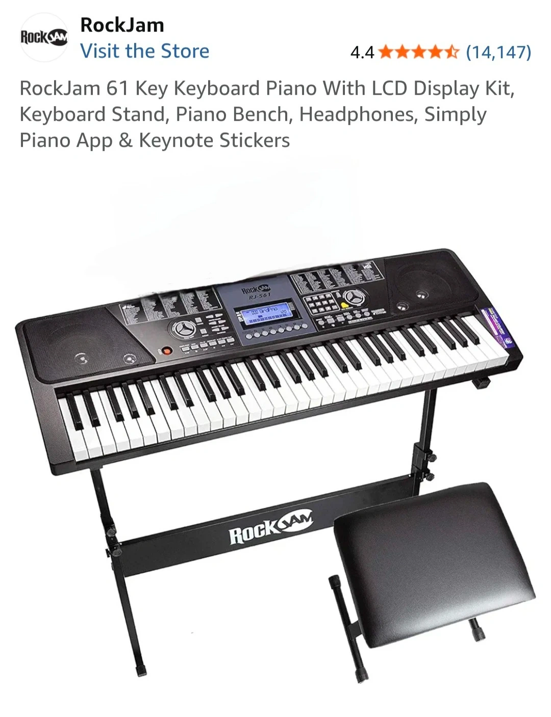This RockJam RJ-561 keyboard piano has 61 full-size keys and an LCD display panel. It comes with