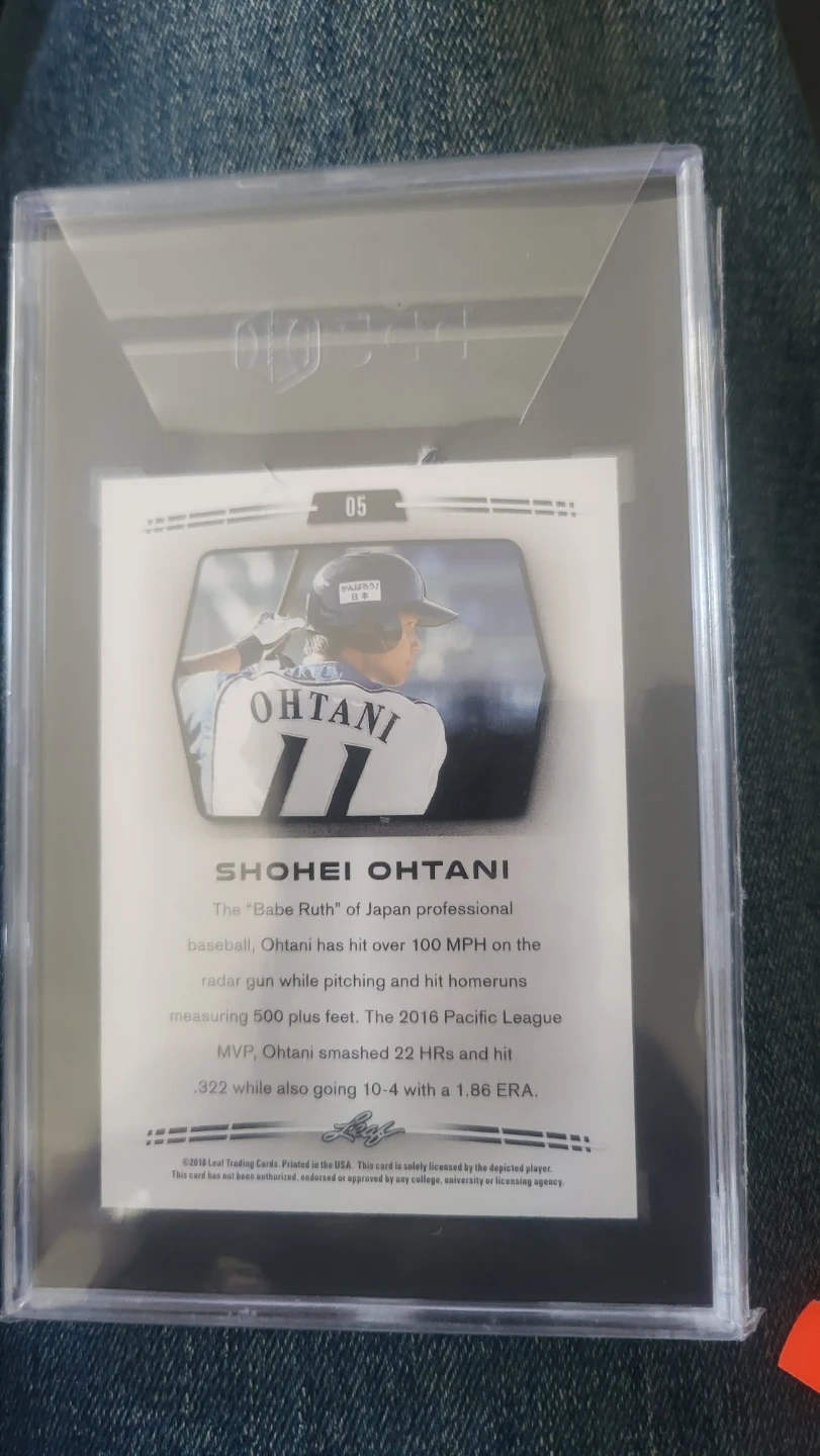 This is a 2018 Leaf Shohei Ohtani #05 Red trading card. The card is graded an 88 by an unknown grading company. Shohei Ohtani is a professional baseball player from Japan.