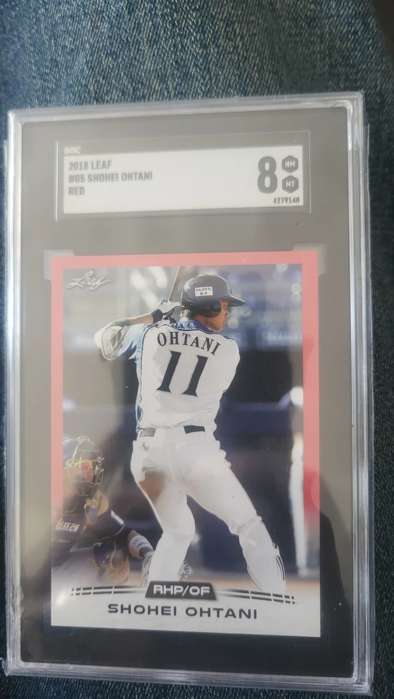 This is a 2018 Leaf Shohei Ohtani #05 Red trading card. The card is graded an 88 by an unknown grading company. Shohei Ohtani is a professional baseball player from Japan.