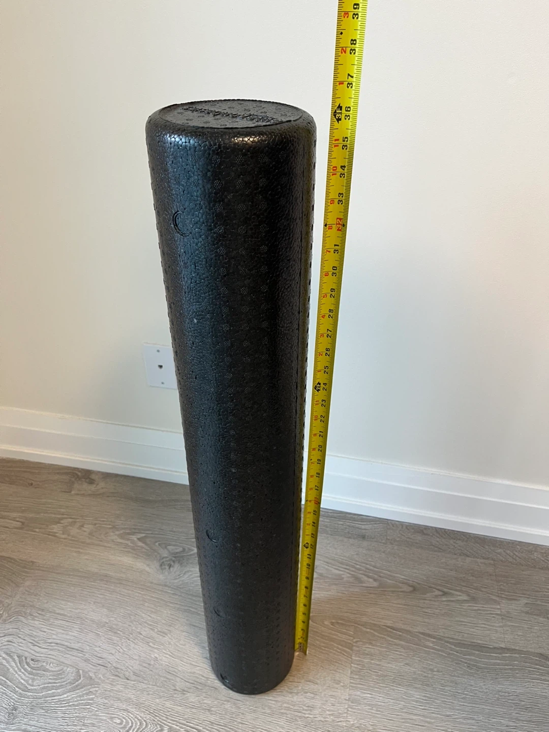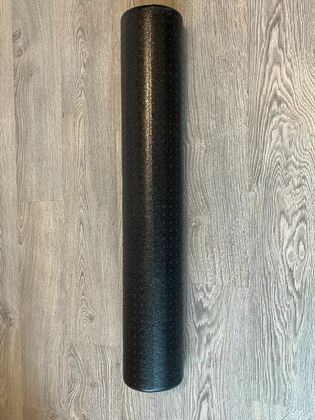 This is a black foam roller, ideal for muscle recovery and stretching. It's made of durable foam. This roller is approximately 36 inches long.