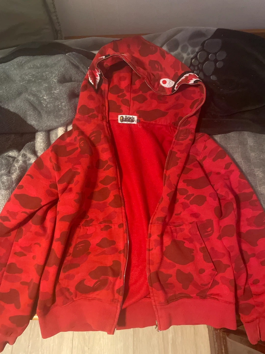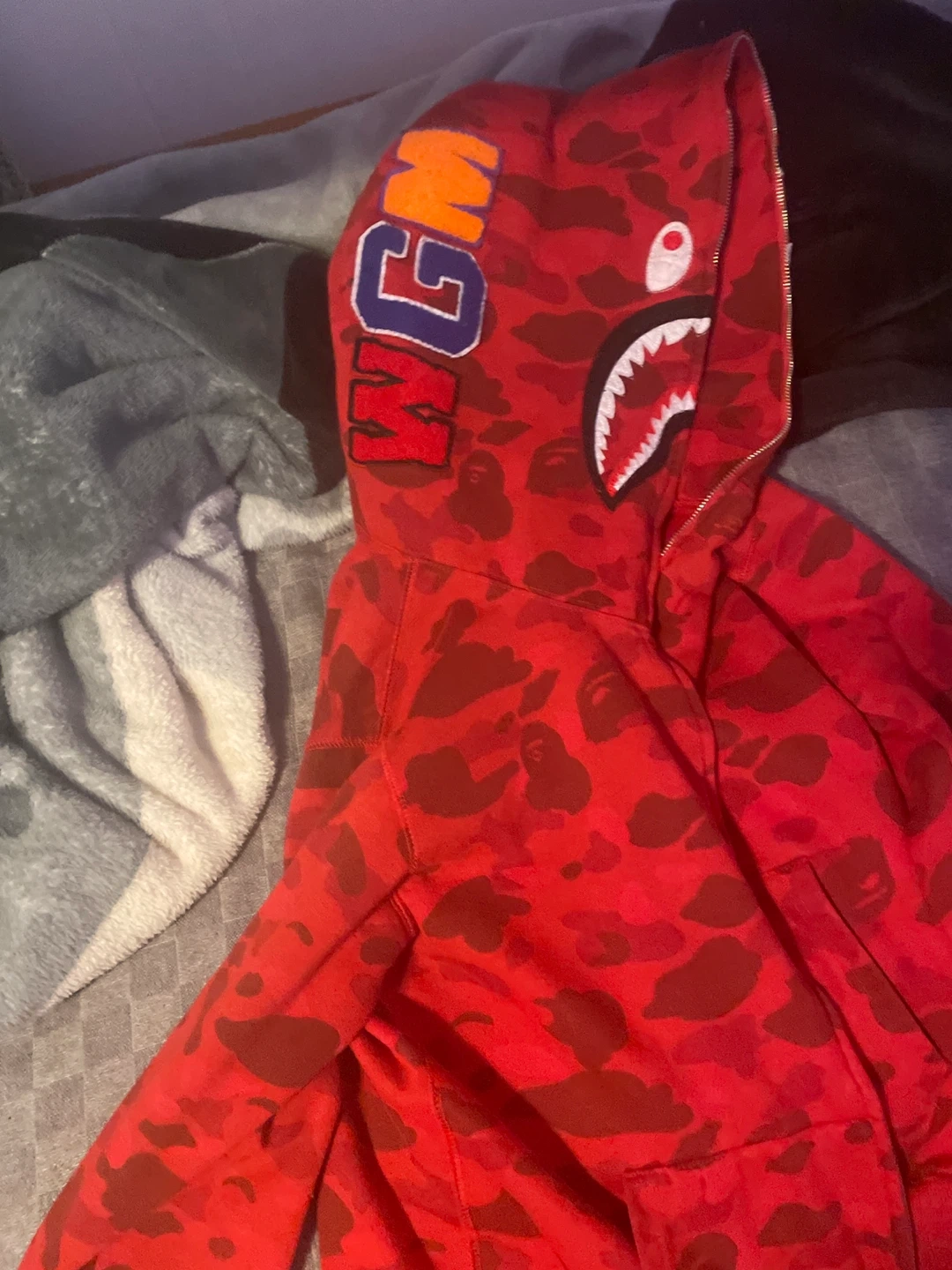 BAPE full zip hoodie in red camo. Features the iconic shark graphic and "WGM" text on the hood. Made from comfortable material for everyday wear.