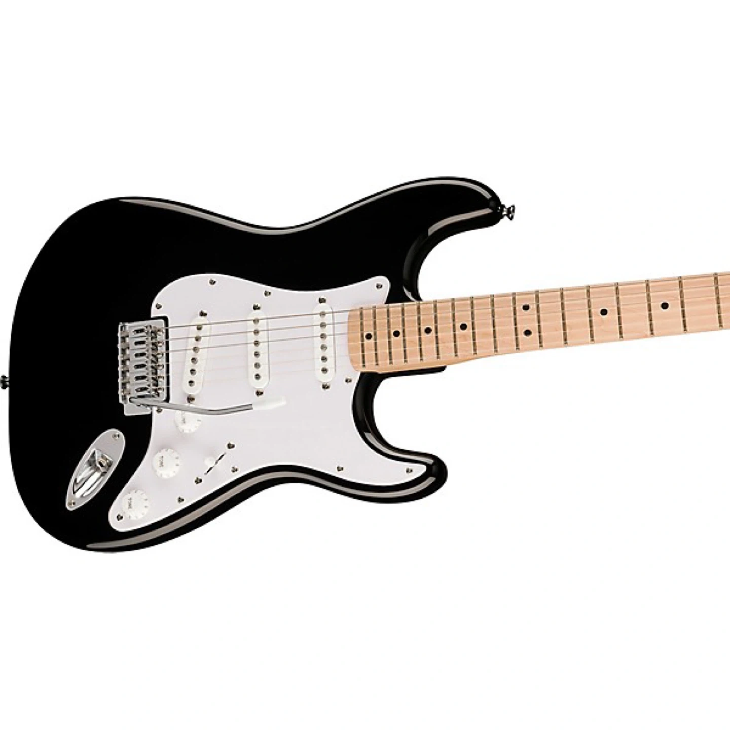 This Squier Stratocaster is a black electric guitar. It has a maple neck and fretboard with dot inlays. It features three single-coil pickups and a tremolo system.