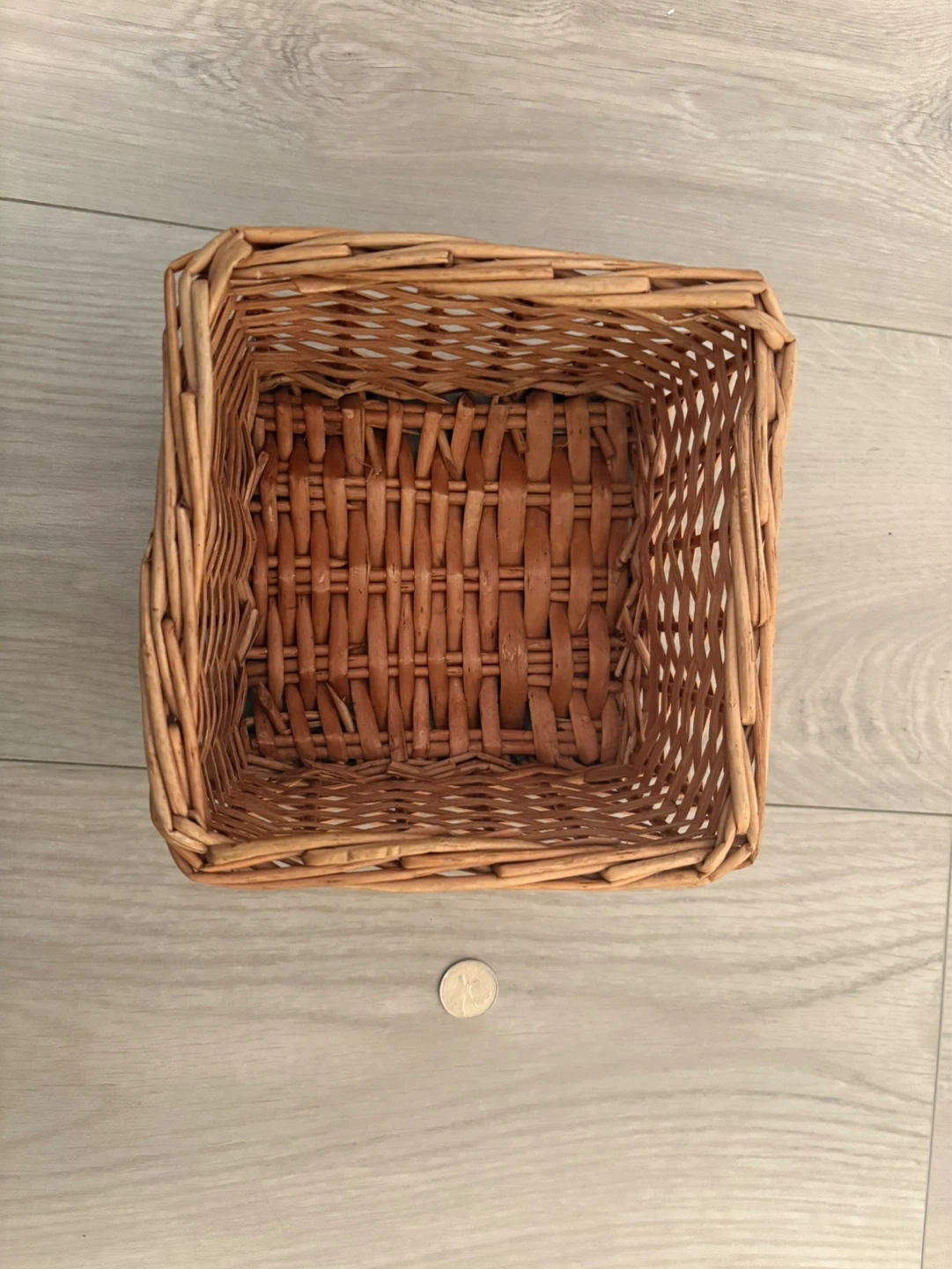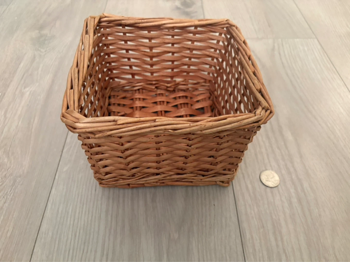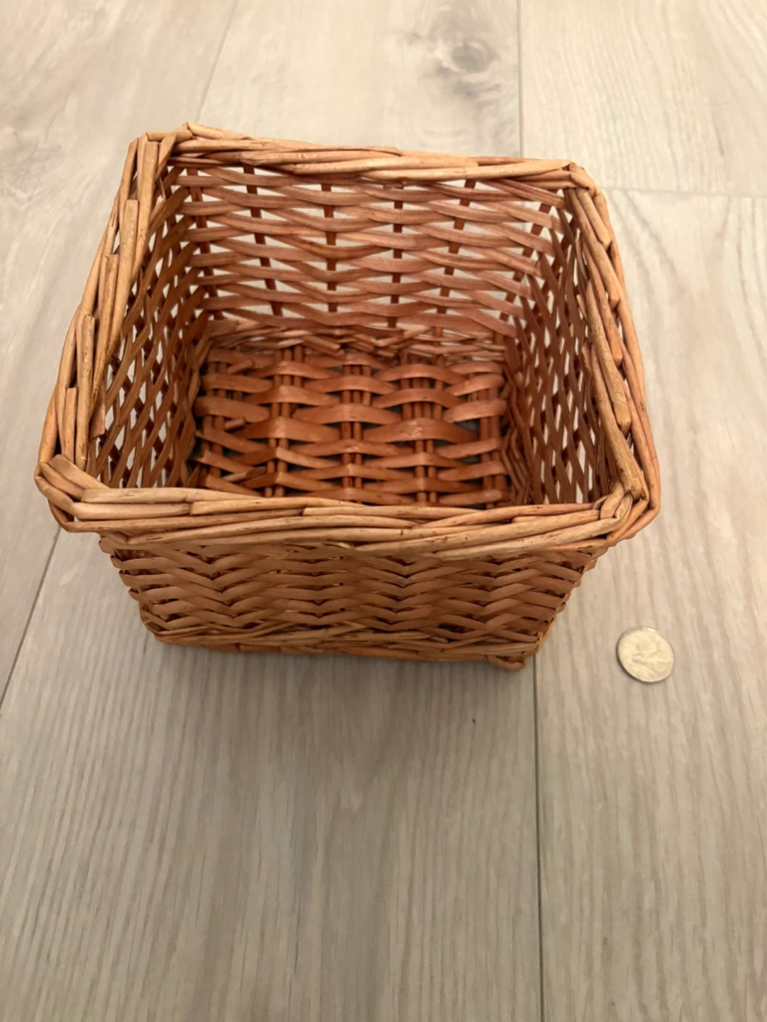 This is a small, square woven wicker basket. It's made from natural wicker material. This basket is handy for small item storage or decorative purposes.