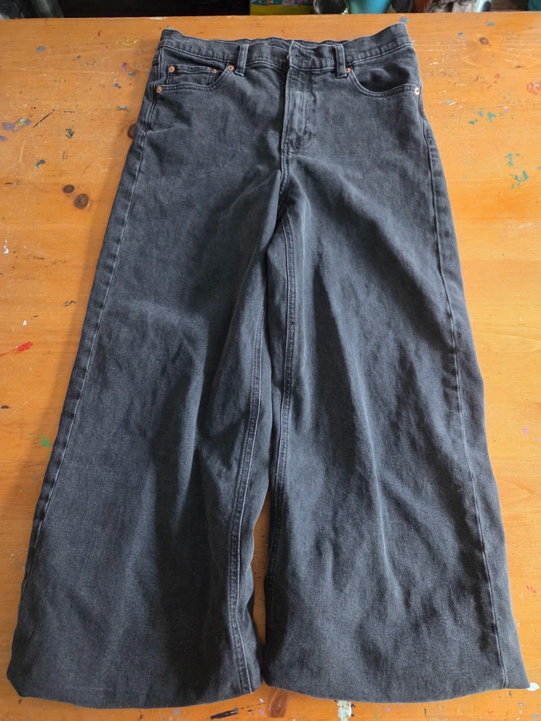 Selling a pair of black wide leg jeans! They're in great condition and ready for a new home in your wardrobe. These jeans offer a stylish and comfortable fit, perfect for any casual occasion