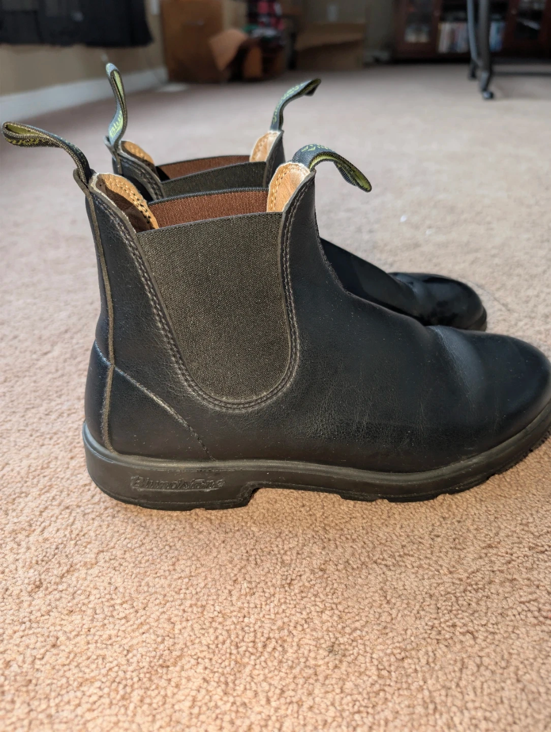 Classic Blundstone Chelsea boots in black leather. Features elastic side panels for easy on and off. Durable construction for everyday wear. These boots are waterproof and breathable.