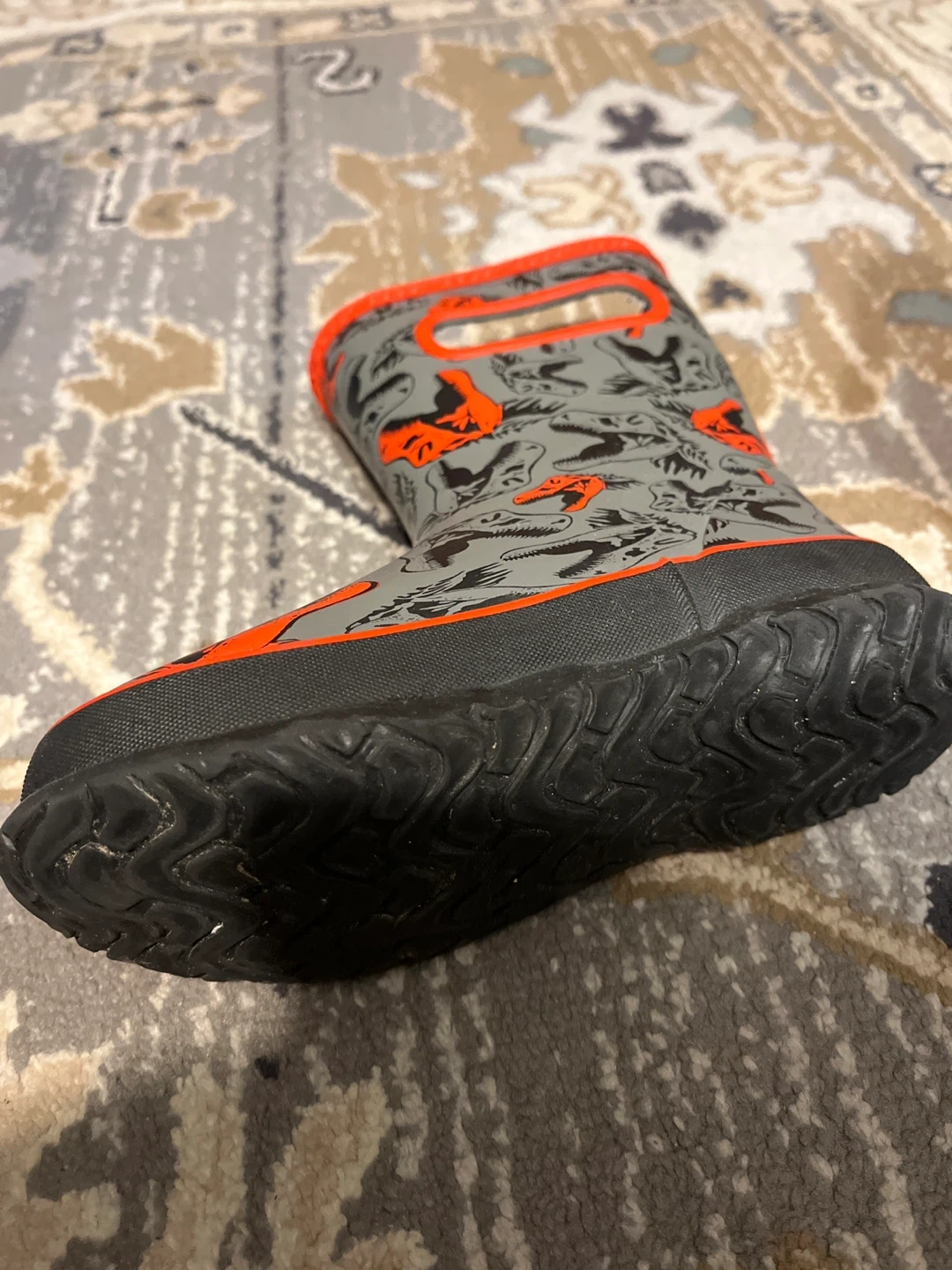These Bogs rain boots are perfect for your little one! They feature a fun dinosaur pattern in shades of gray and orange. Size 13 these boots are in great condition and ready for splashing in puddles!