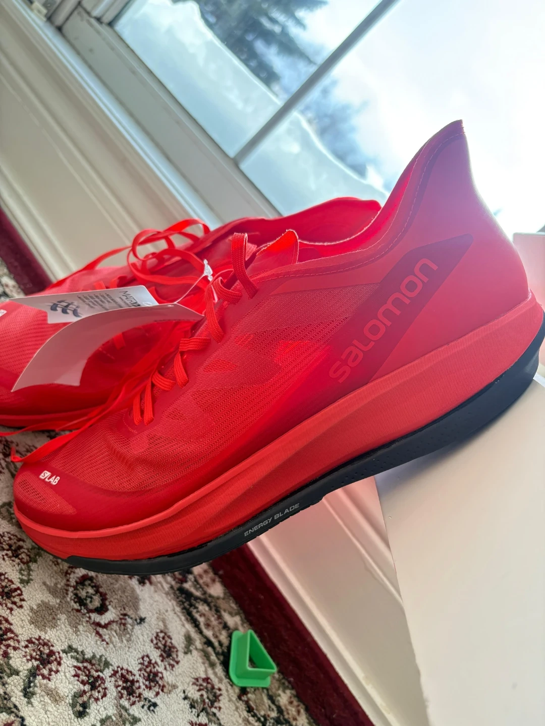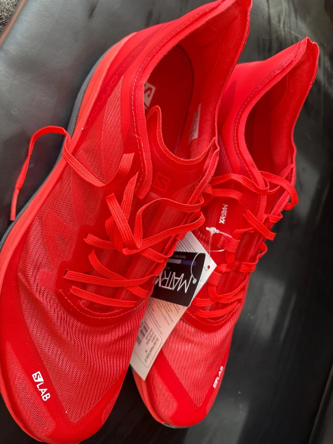 These are Salomon S/LAB red running shoes. They feature a lightweight mesh upper and a durable sole with "Energy Blade" technology. Great for trail running!