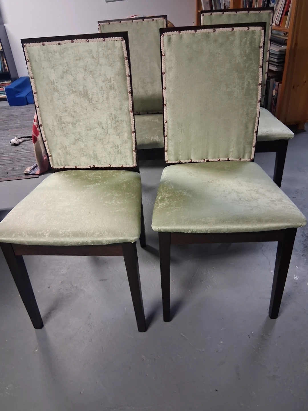 Selling a set of four dining chairs with a light sage green chintz upholstery. These chairs have dark wood legs and decorative nailhead trim along the back. They'd make a nice addition to any dining room!