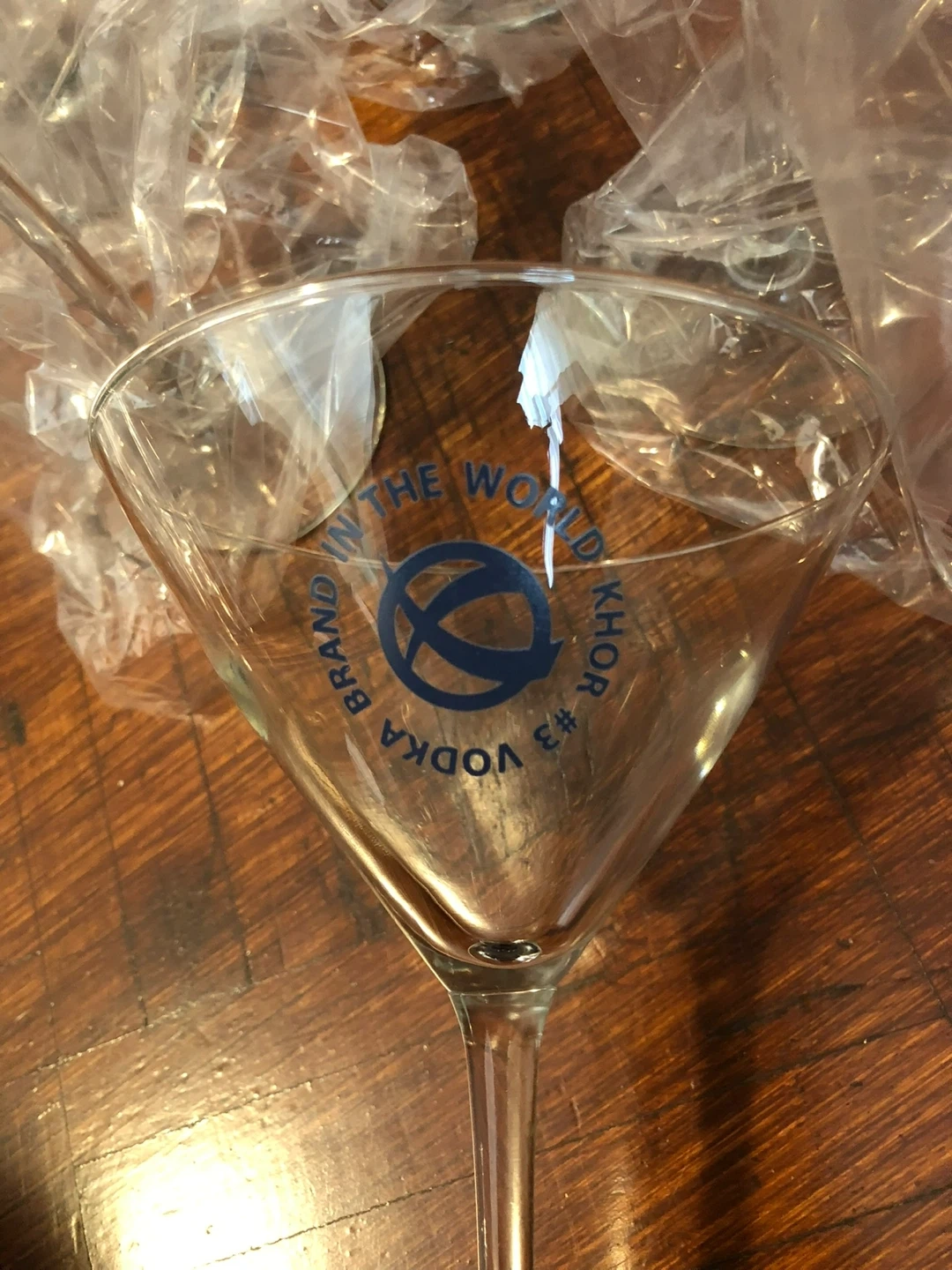 Set of six martini glasses featuring the Khor Vodka brand. Clear glass construction. Perfect for serving cocktails at your next gathering!