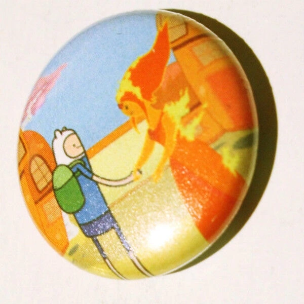 1" circular pin featuring Finn and Flame Princess from Adventure Time. Artwork by www.draculaisstillathreat.com. Let me know if you're interested!