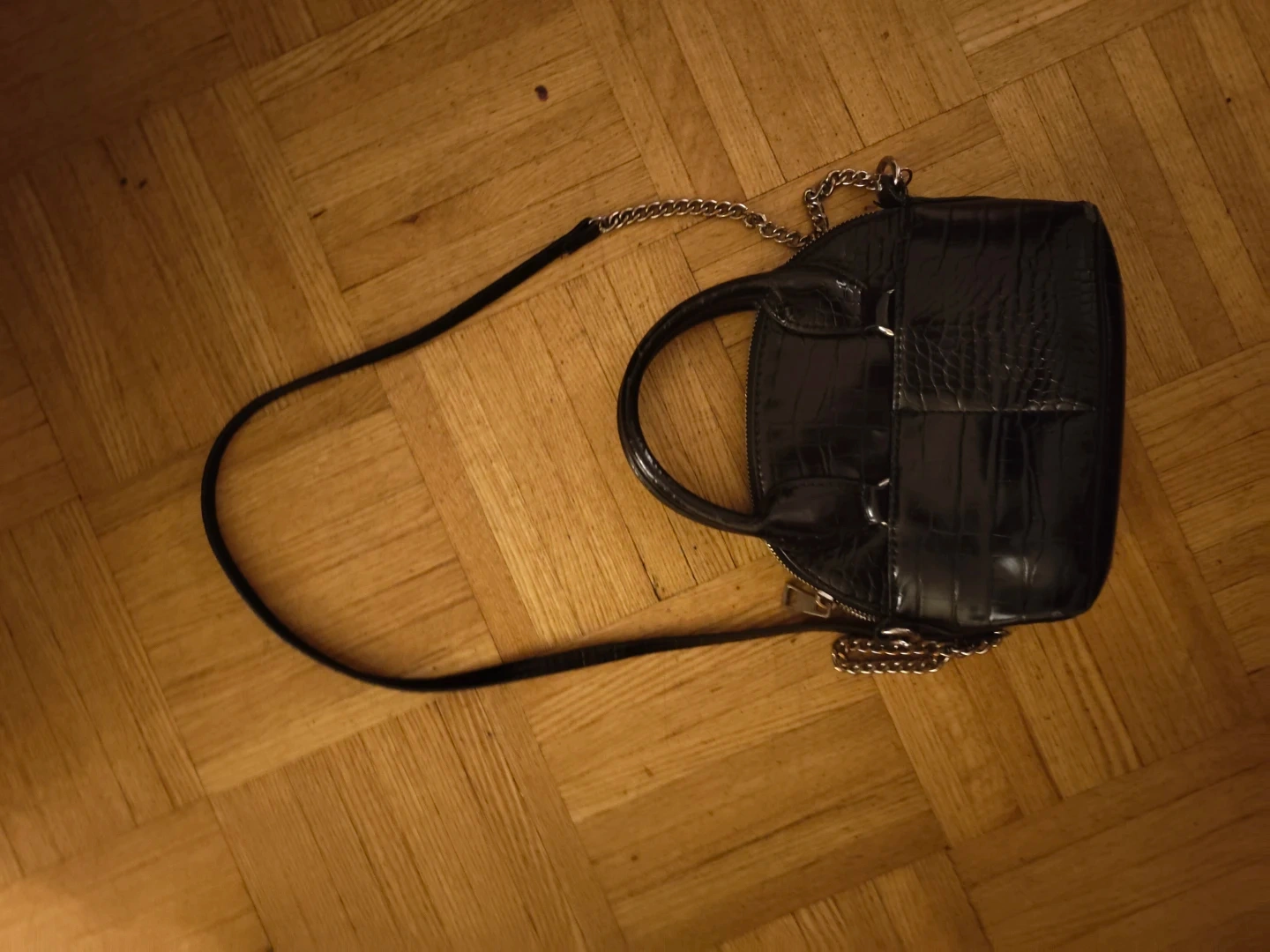 Shiny black faux crocodile textured handbag. Features dual top handles and a detachable silver-tone chain strap. It has a zippered closure. This bag is a small size.