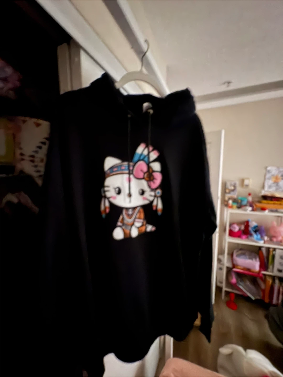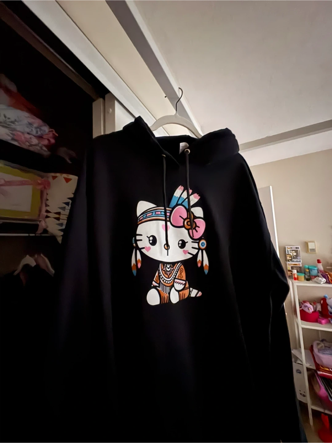 Black hoodie featuring a graphic of Hello Kitty wearing a Native American-inspired headdress and outfit. It's a comfortable pullover style with a drawstring hood. This hoodie would be great for fans of Hello Kitty or anyone looking for a unique graphic top.
