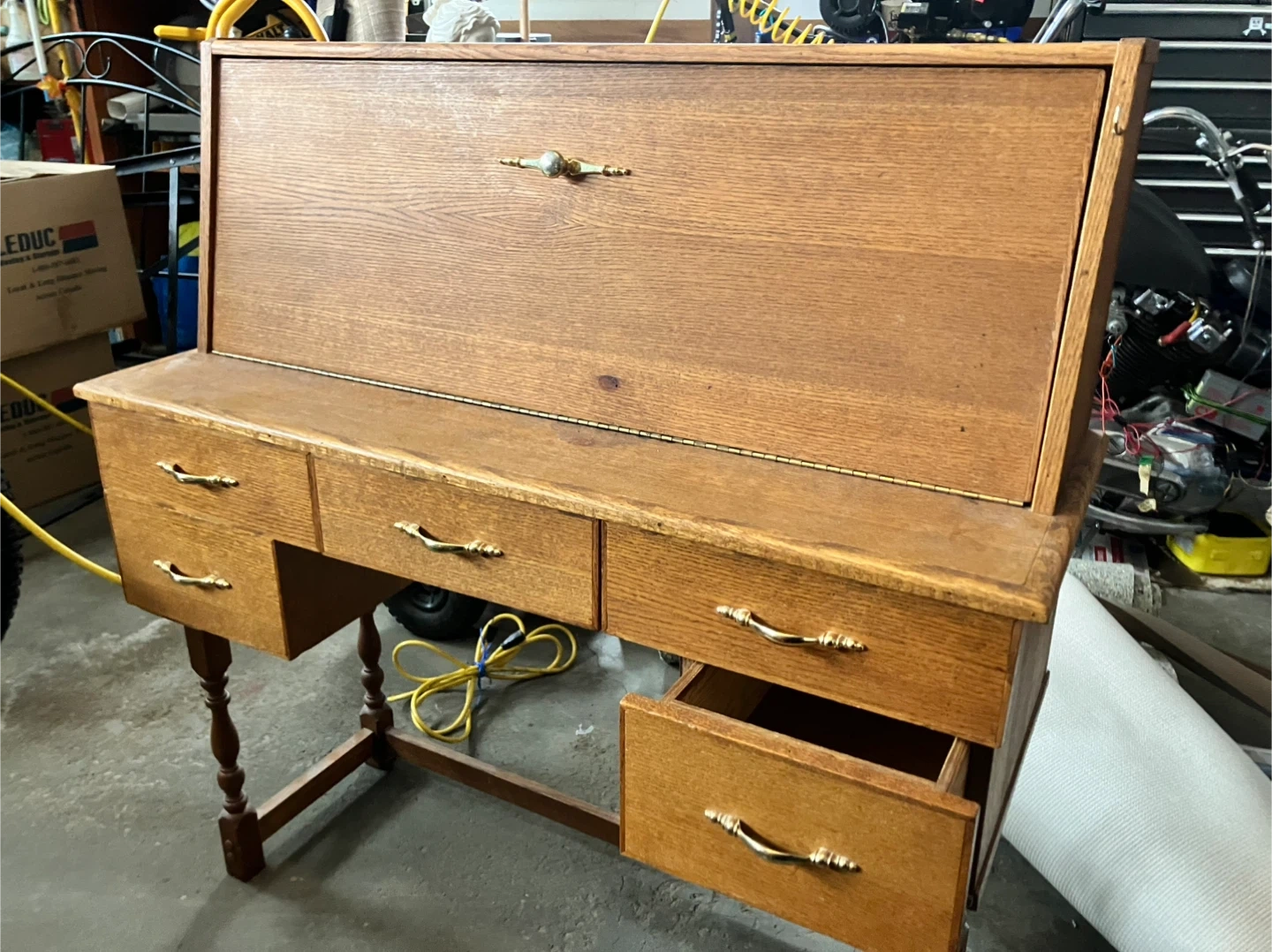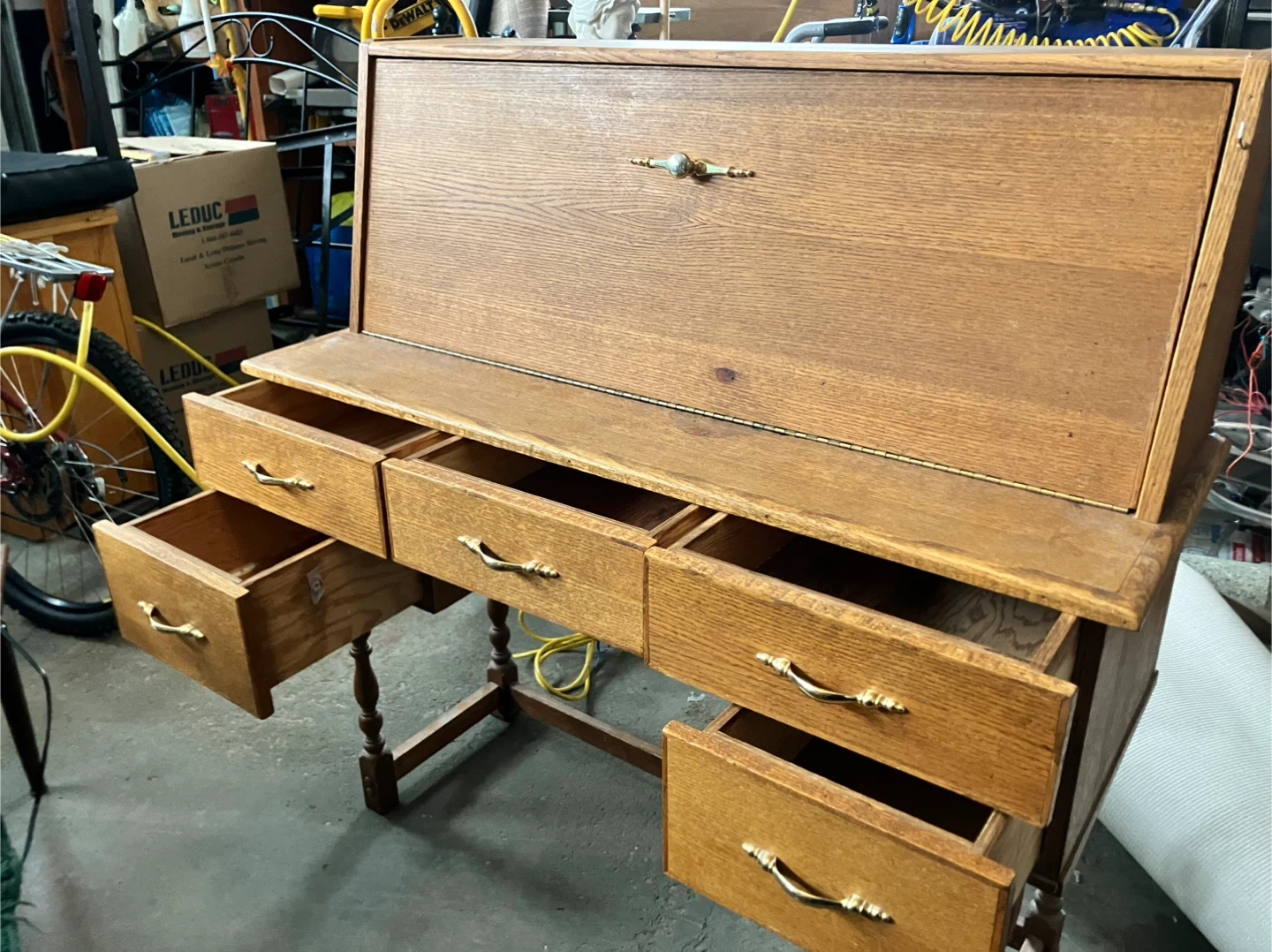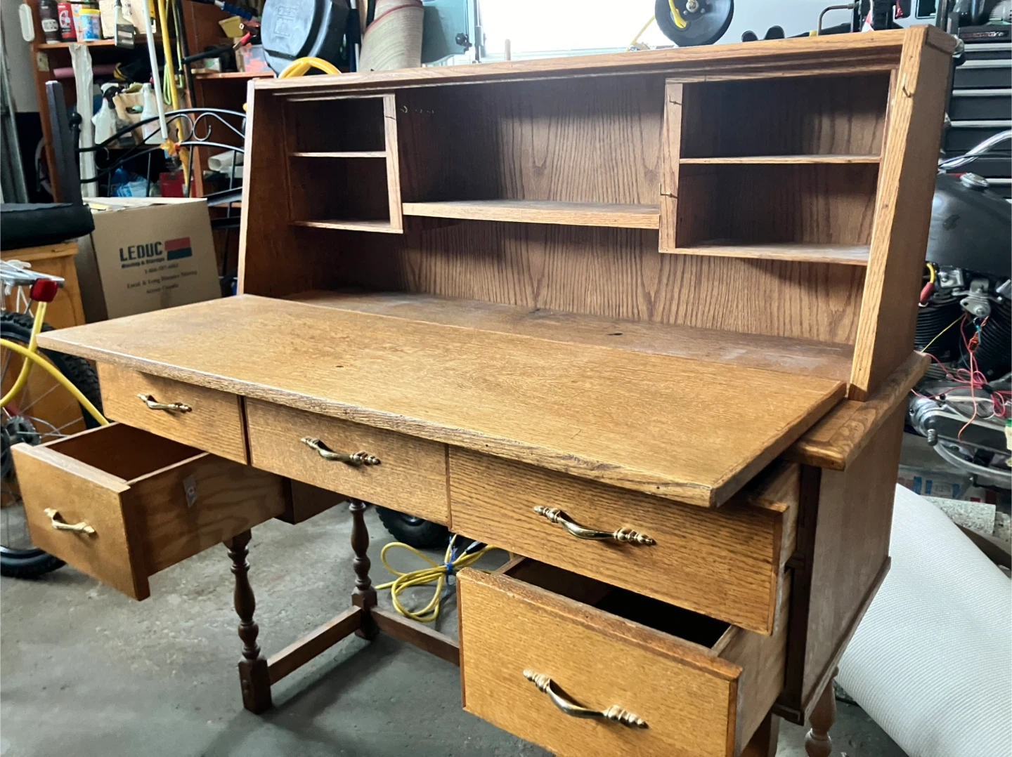 This vintage secretary desk features a fold-down writing surface and a hutch with shelves. It's made of oak wood and has several drawers for storage. The hutch provides organizational space.