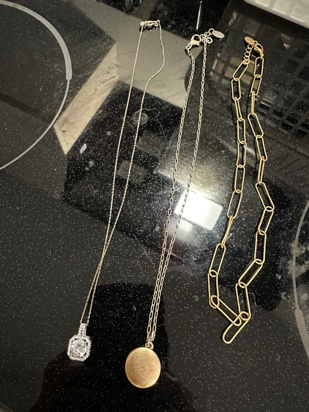 This lot includes three necklaces. One is a rose gold chain with a square-shaped pendant set with small clear stones. Another is a gold-toned chain with a round, matte pendant. The third is a gold-toned paperclip link chain. They're beautiful accessories for everyday wear!