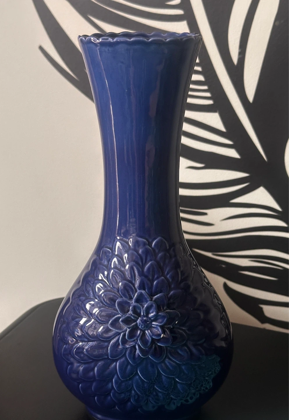 Beautiful dark blue ceramic vase. It features an intricate floral embossed design on its body. This vase has a ruffled rim and a glossy finish. It's perfect for displaying fresh or dried flowers.