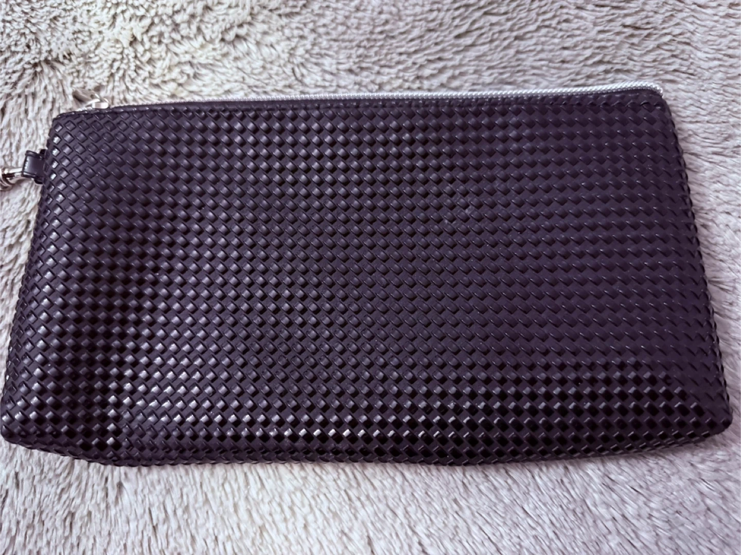 This black clutch purse features stud exterior design and a convenient wrist strap. It's perfect for carrying essentials when you're on the go. The interior is lined and includes a zippered closure.