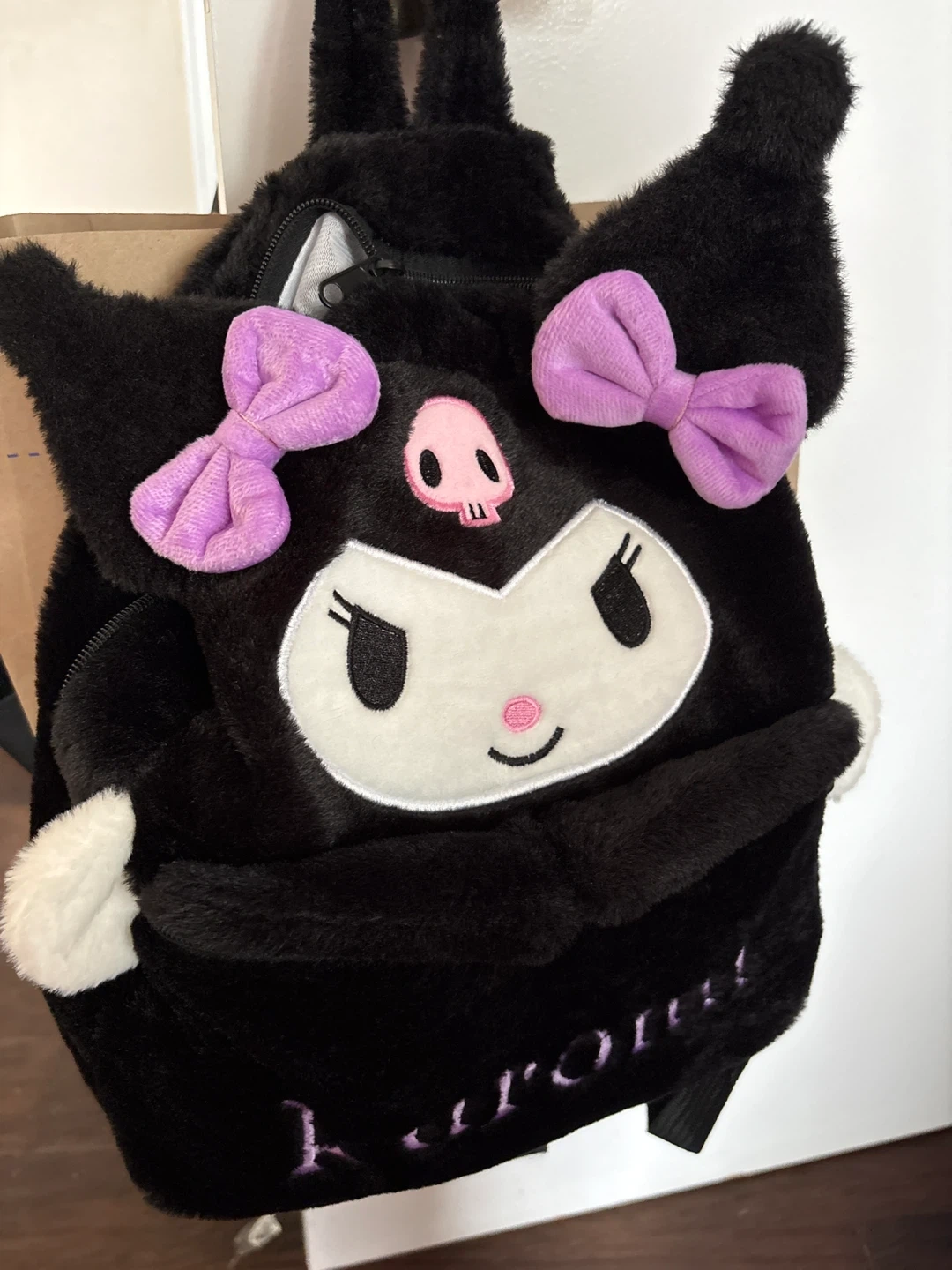 This is a soft, black plush backpack featuring the character Kuromi. It has cute purple bows and a small pink skull detail on the forehead. The name "Kuromi" is embroidered on the front. It's a fun accessory!