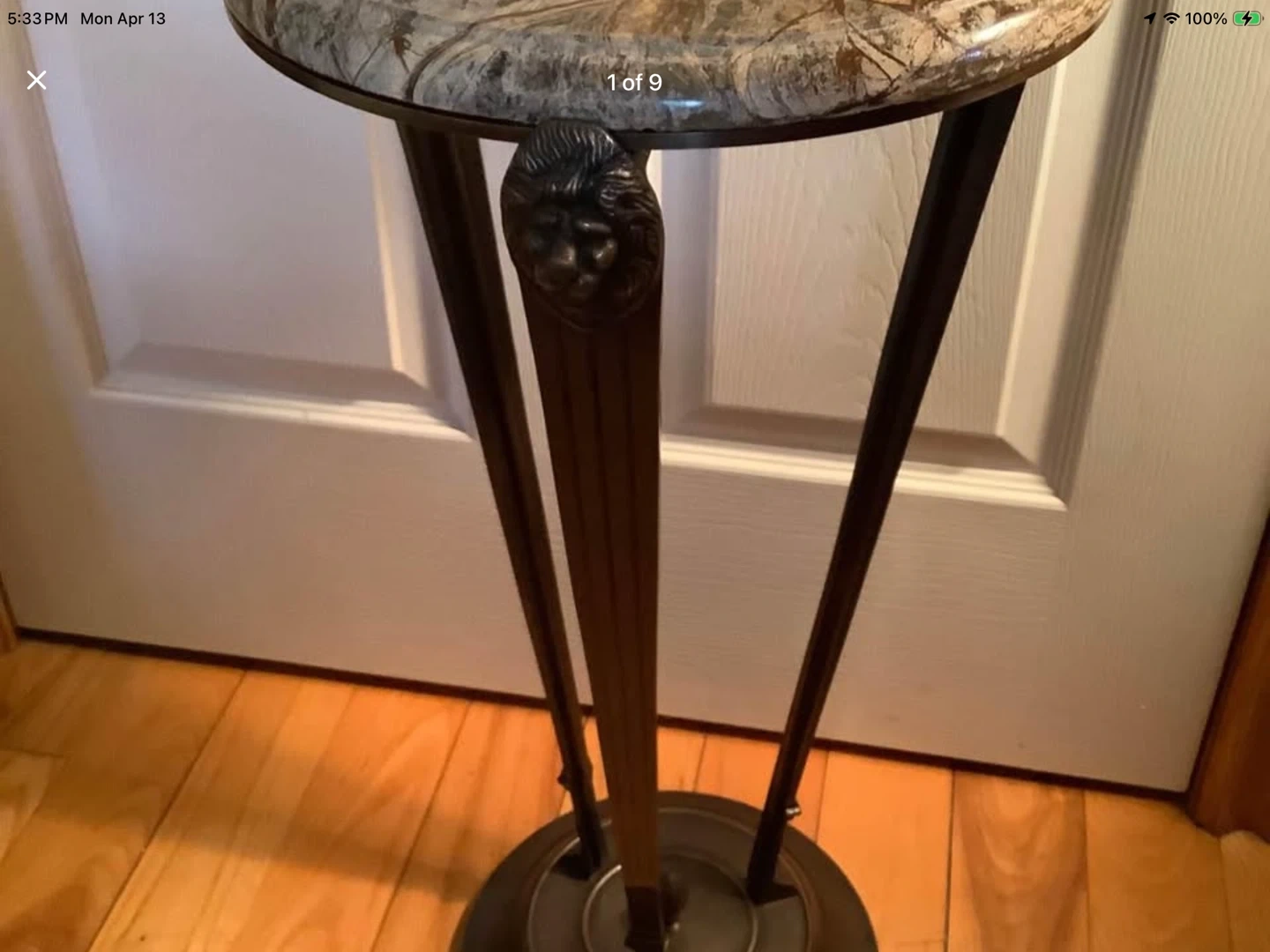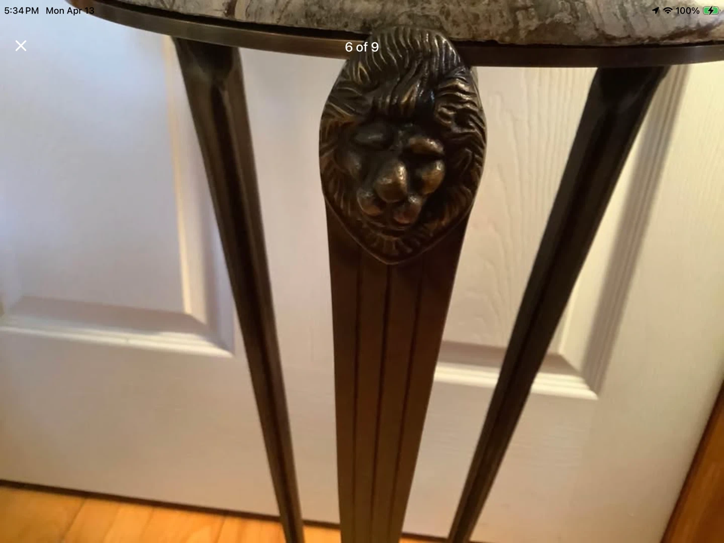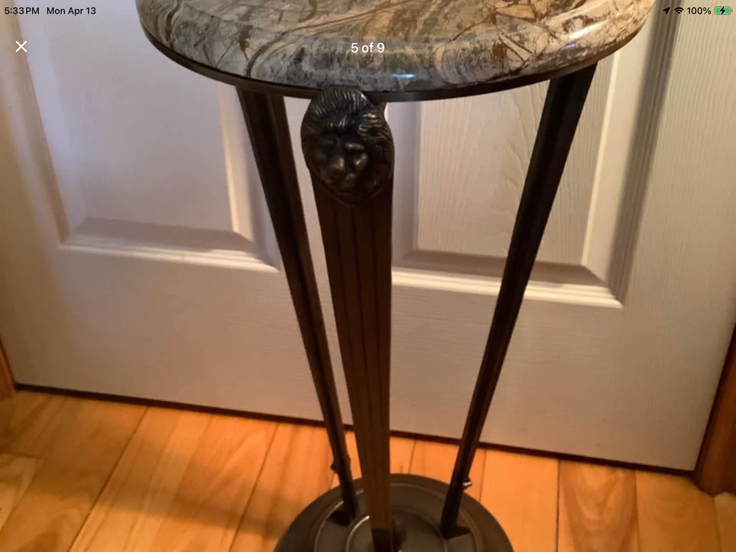 Vintage Bombay Co. marble top plant stand with bronzed legs. Lionβs heads to the top of each leg and paw like feet.