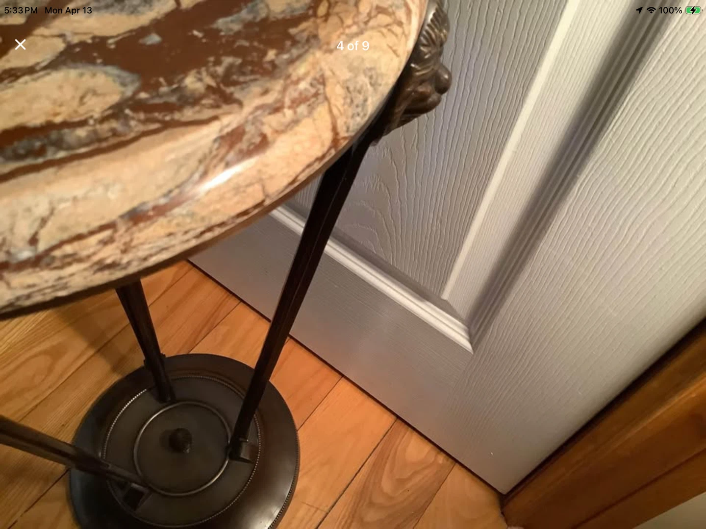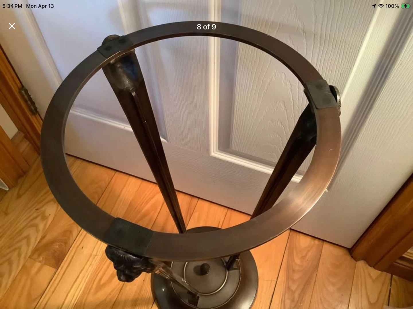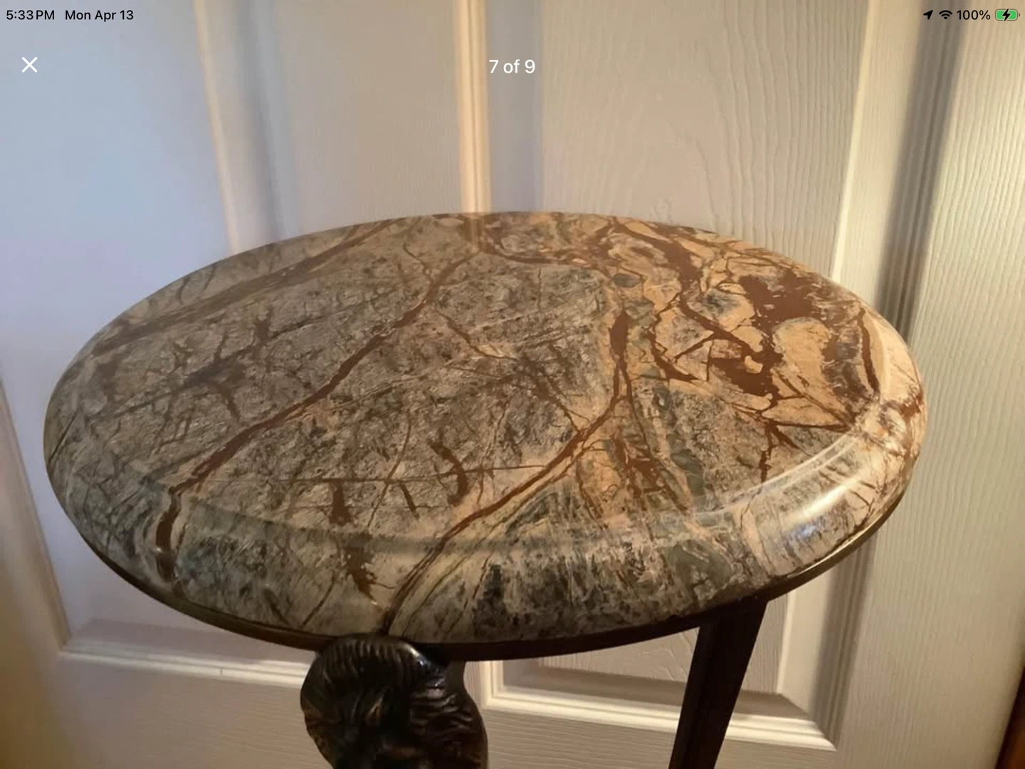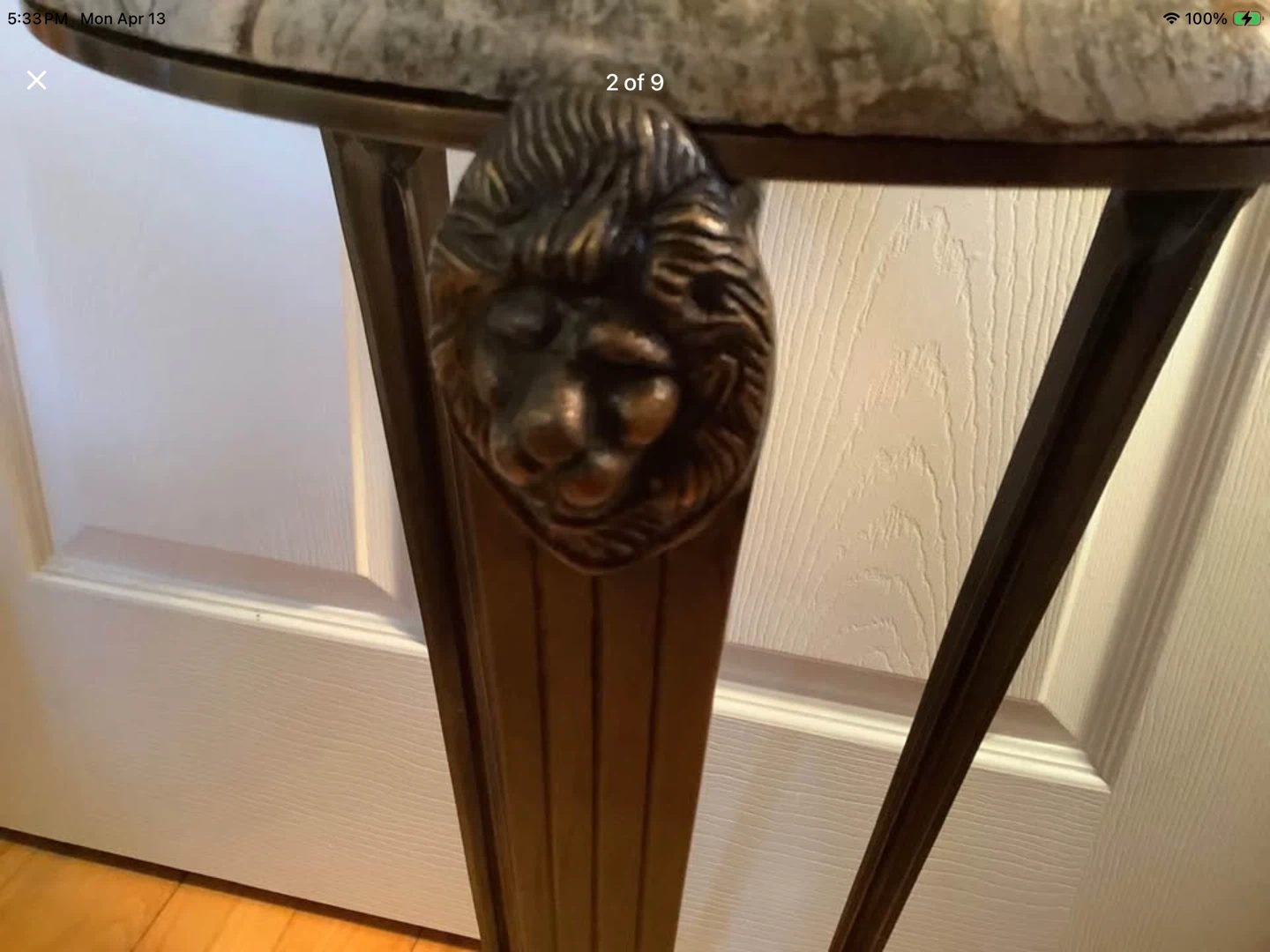 Vintage Bombay Co. marble top plant stand with bronzed legs. Lionβs heads to the top of each leg and paw like feet.