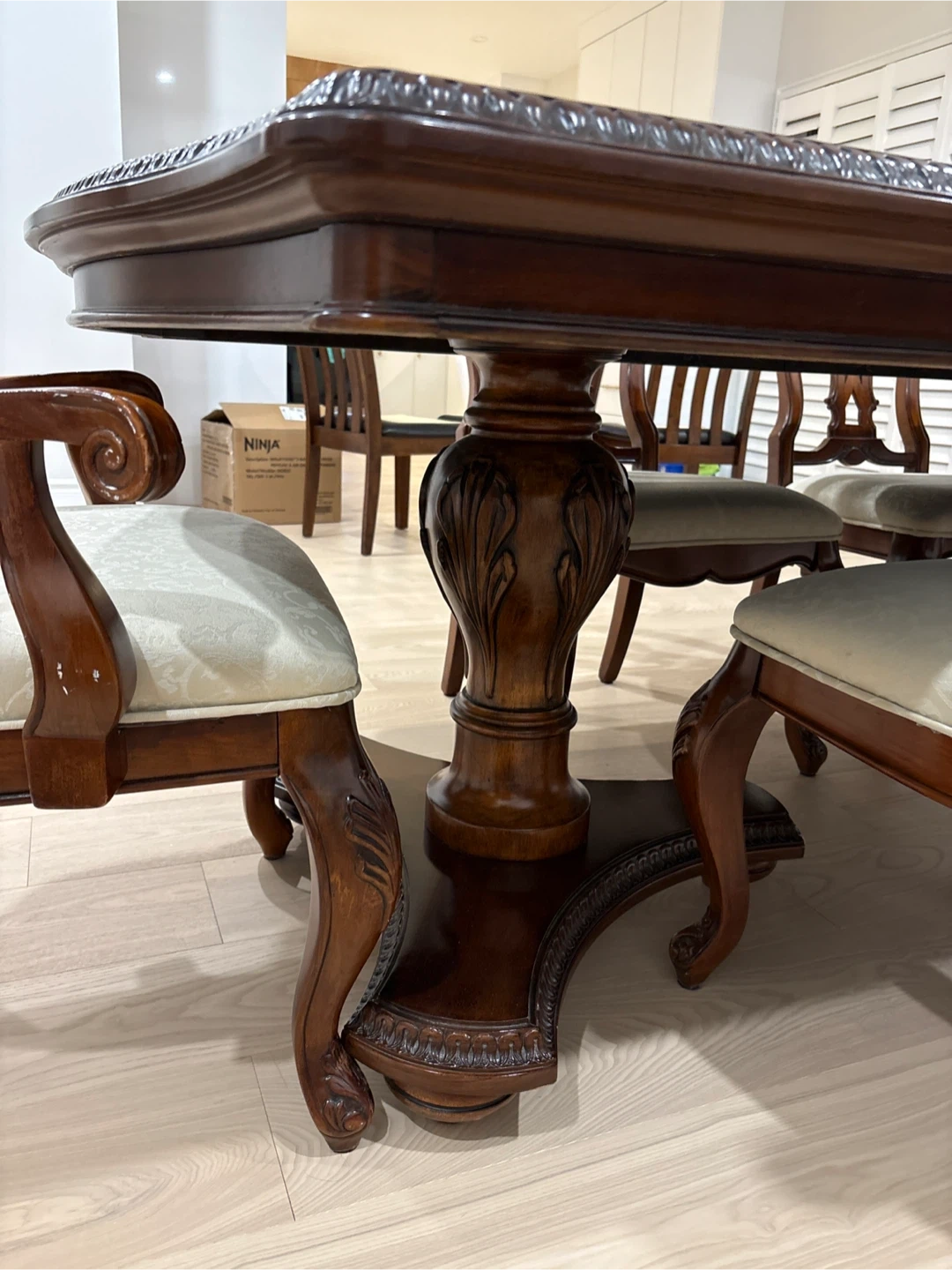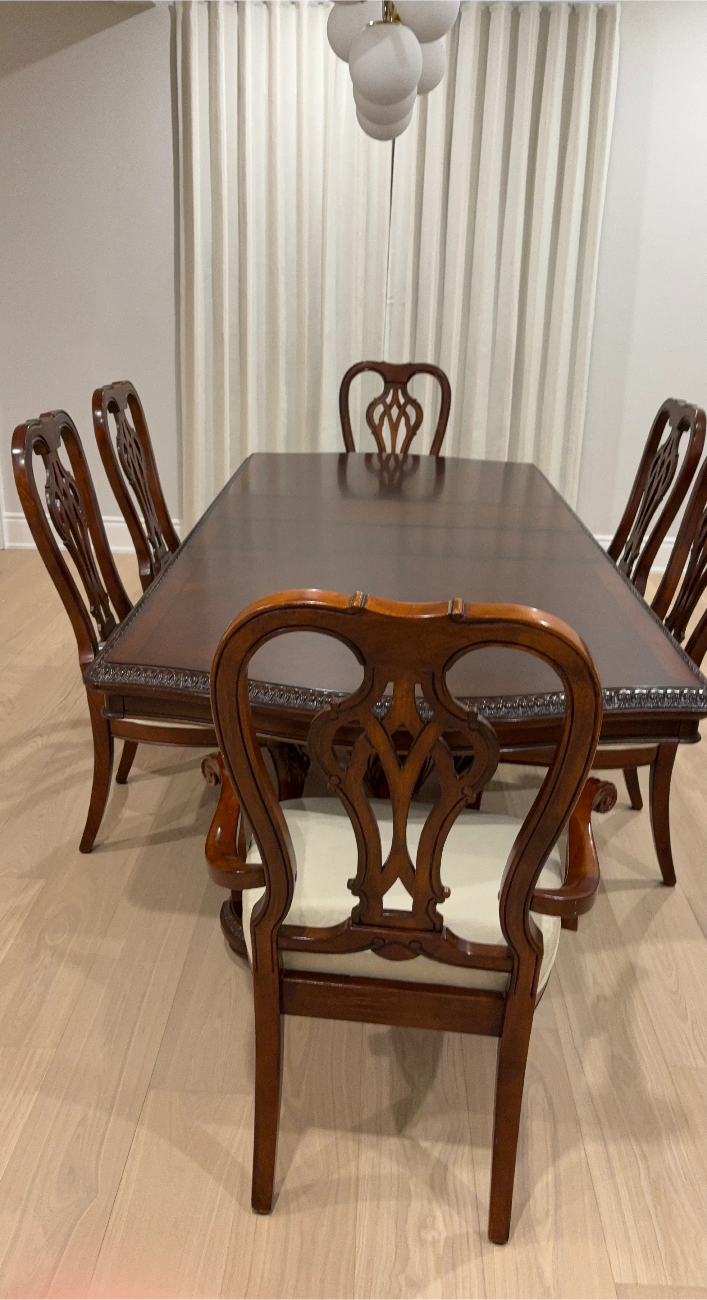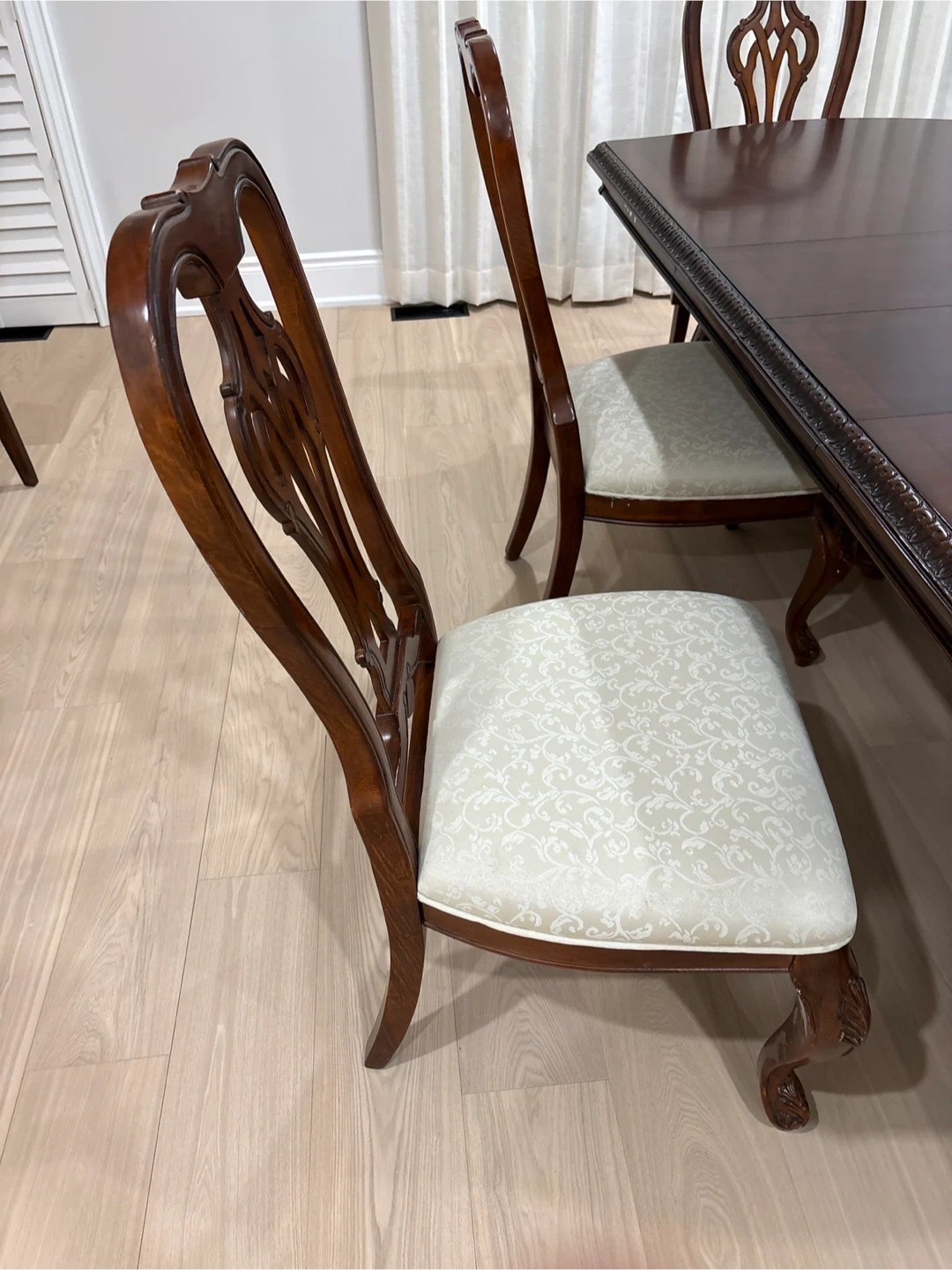 A beautiful wooden dining table set that includes six chairs. This set features intricate carvings on the table and chair legs. The chair seats are upholstered in a light, patterned fabric. It's perfect for family dinners and hosting guests!