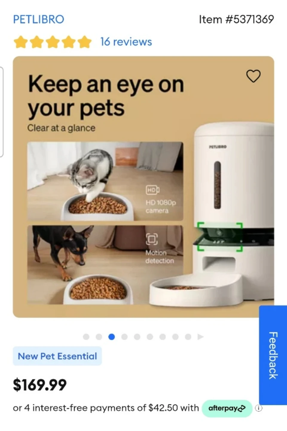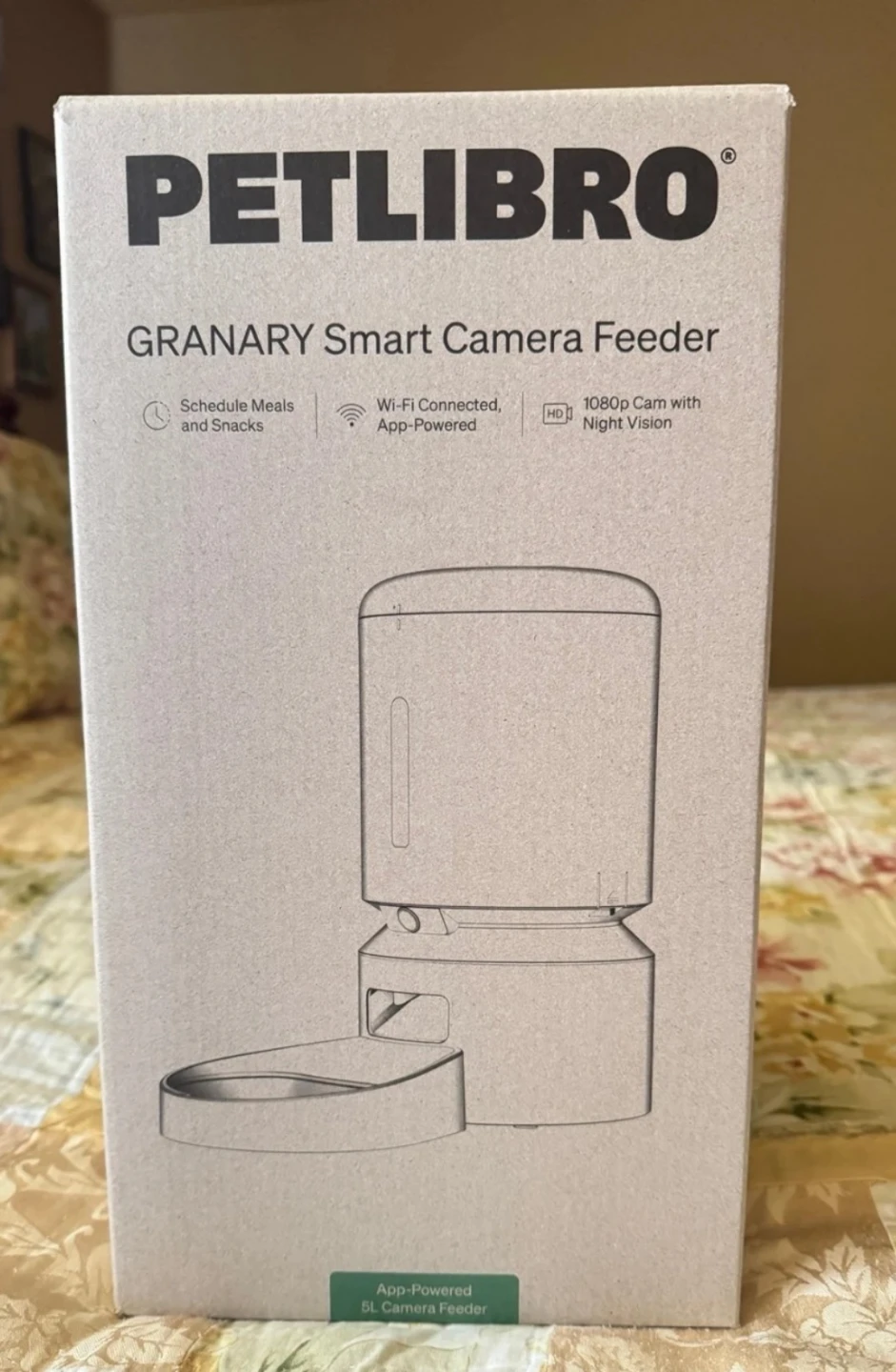 This is the PETLIBRO GRANARY Smart Camera Feeder with a 5L capacity. It's Wi-Fi connected and app-powered, featuring a 1080p camera with night vision and motion detection. Schedule meals and snacks for your pets remotely. This feeder is useful for pet owners who want to ensure their pets are fed on time, even when they're not home.
