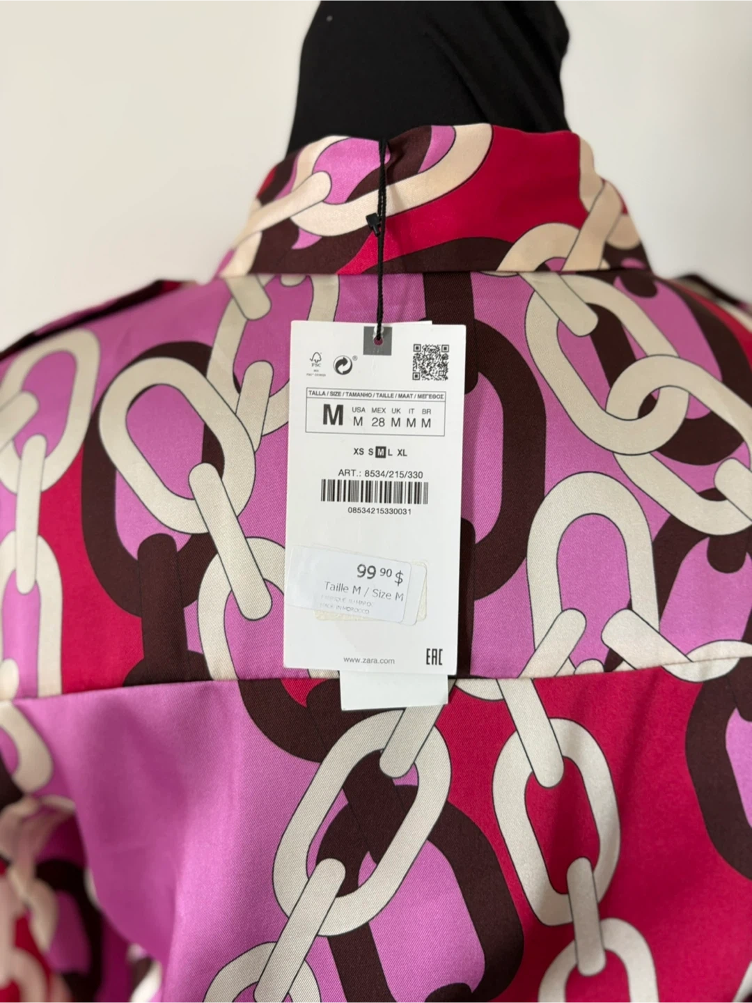This is a Zara midi dress with a vibrant chain print. It's a size Medium and features a belted waist. The fabric feels silky and it has long sleeves.
