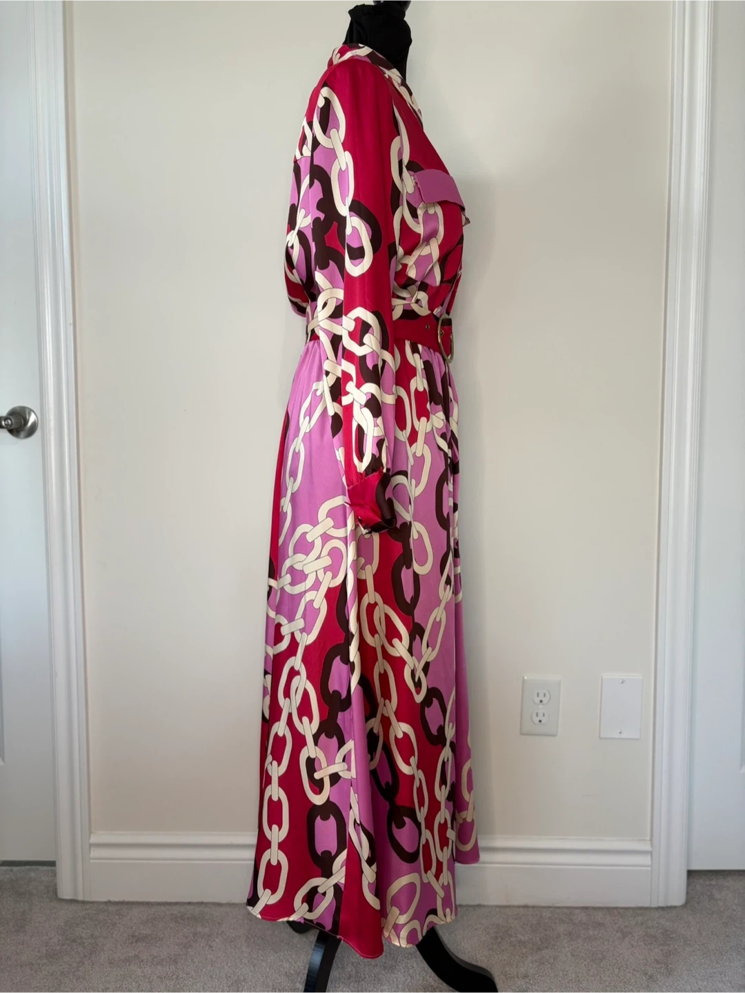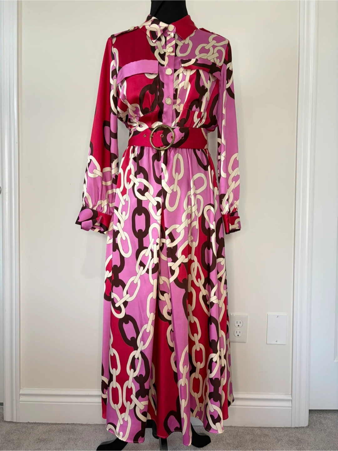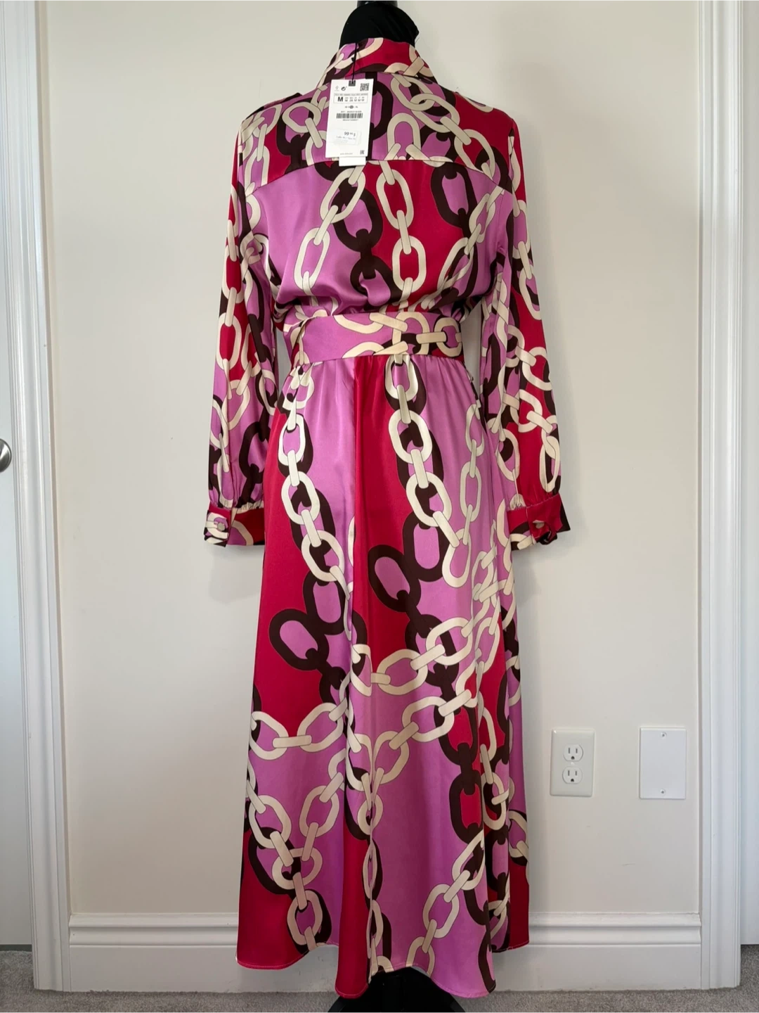 This is a Zara midi dress with a vibrant chain print. It's a size Medium and features a belted waist. The fabric feels silky and it has long sleeves.