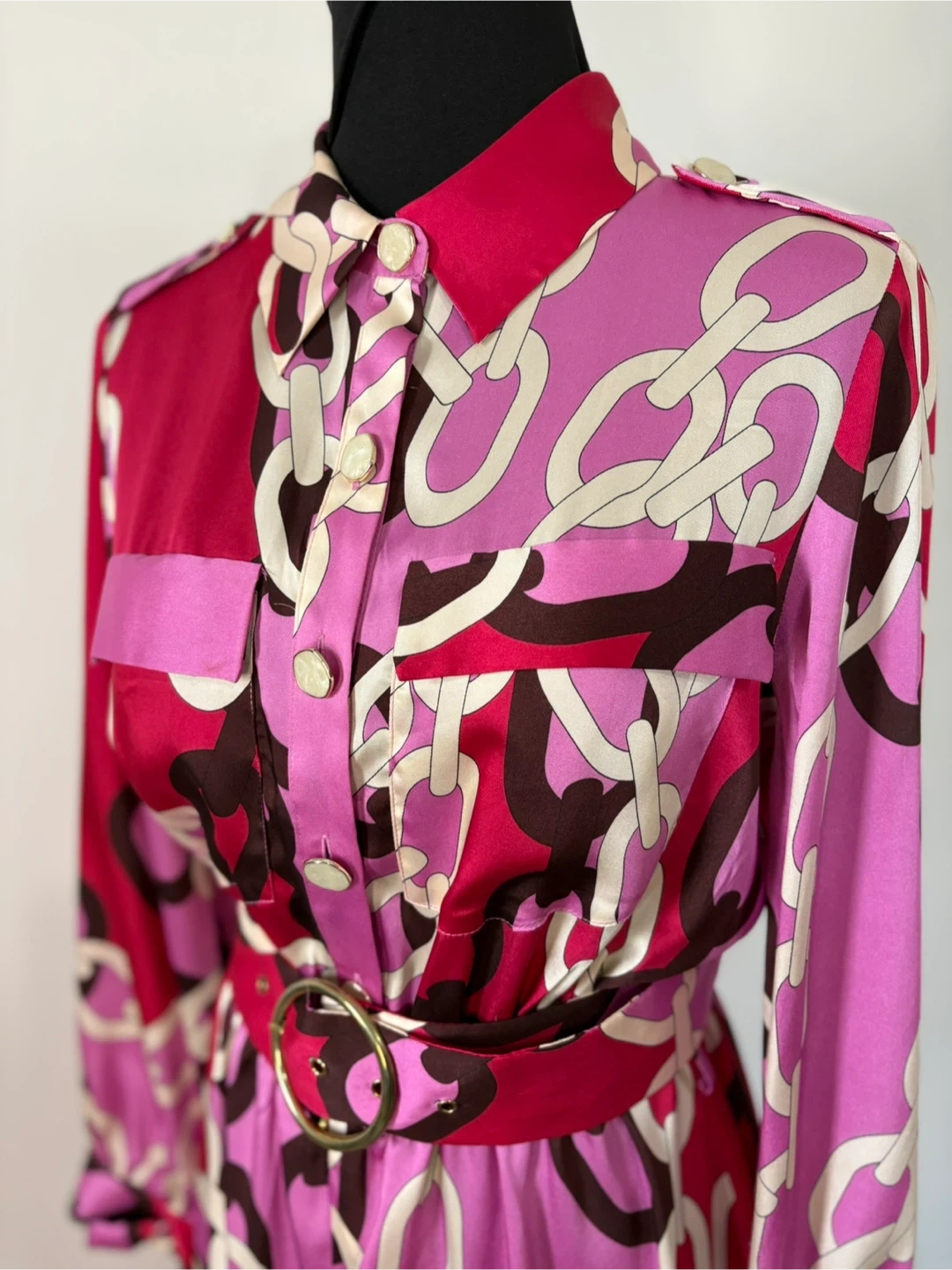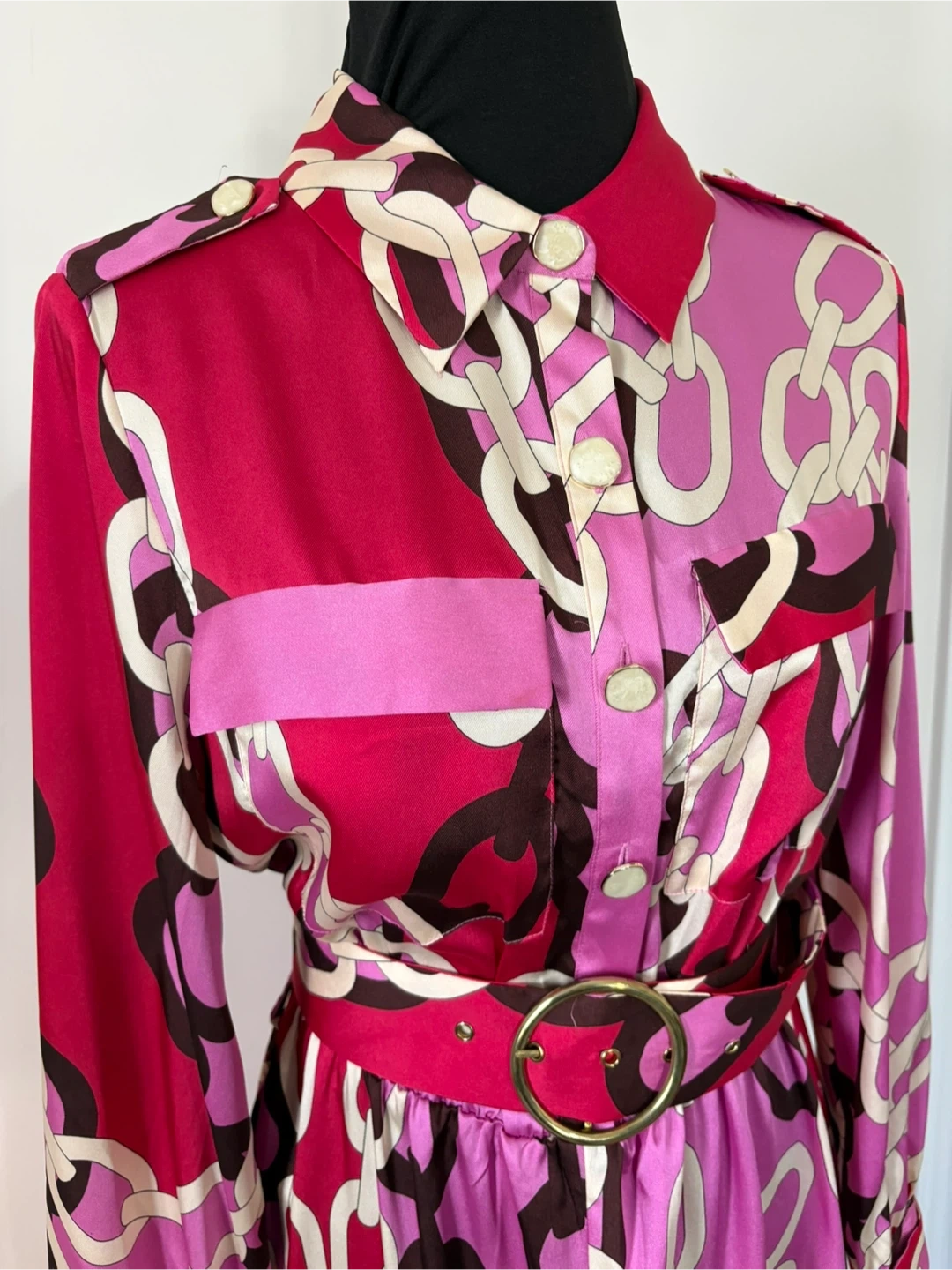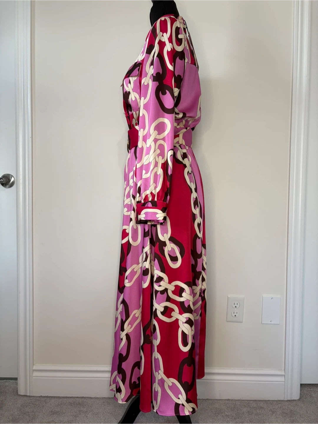 This is a Zara midi dress with a vibrant chain print. It's a size Medium and features a belted waist. The fabric feels silky and it has long sleeves.