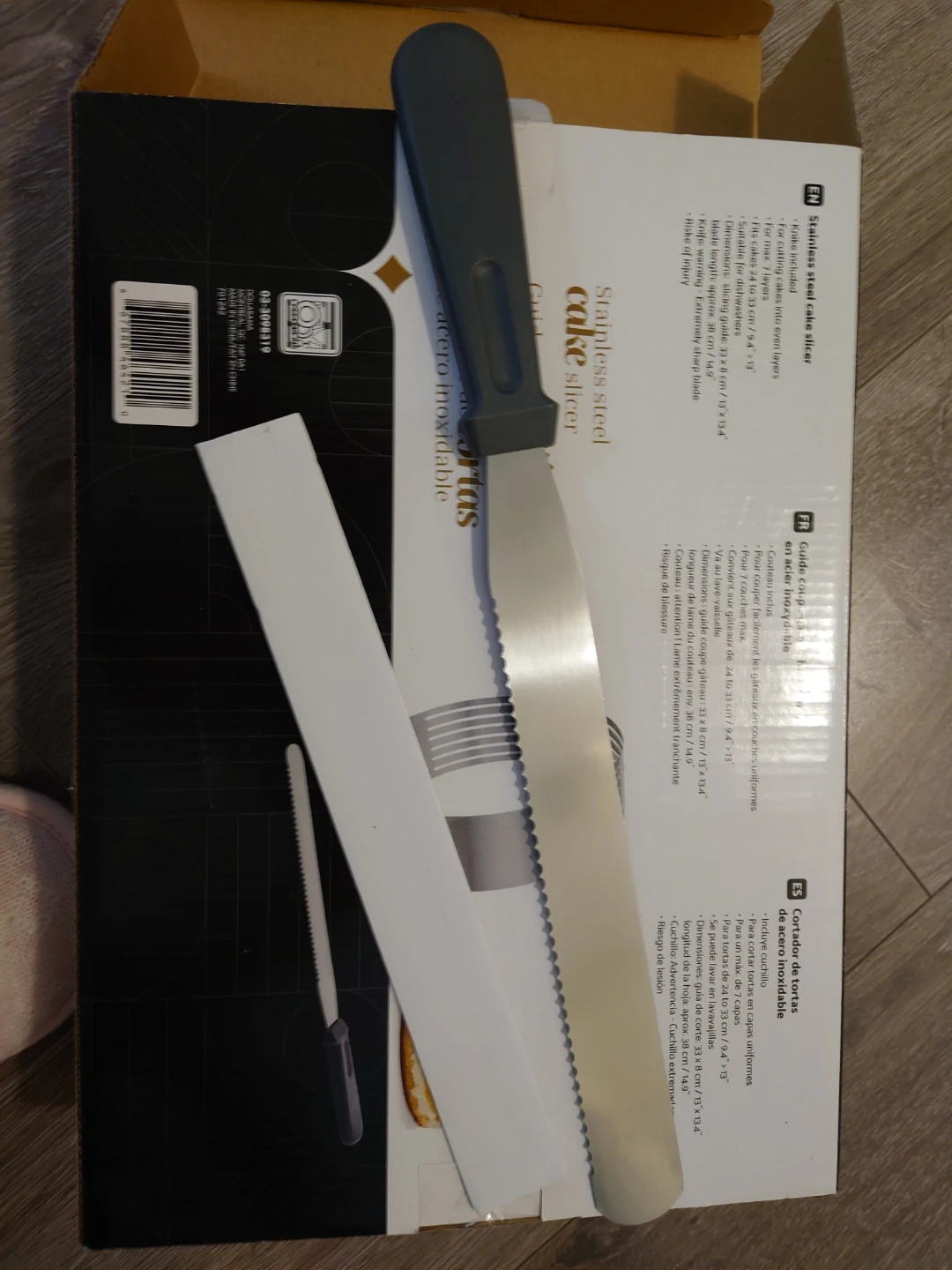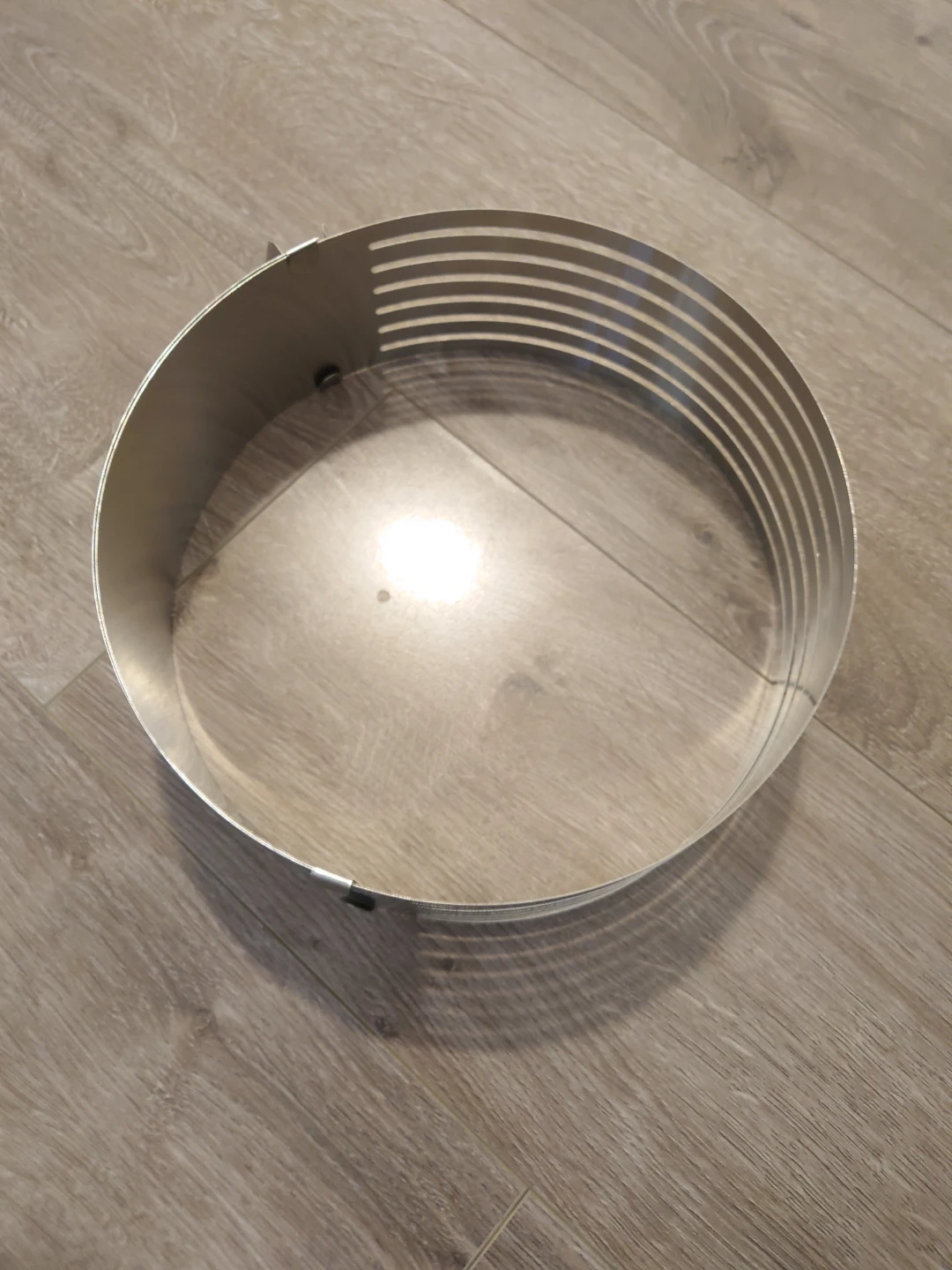 Stainless steel cake slicer and horizontal cake layerer. Fits cakes up to 10" / 25.4 cm. Blade length approx. 13" / 33 cm. Makes cutting even layers easy!