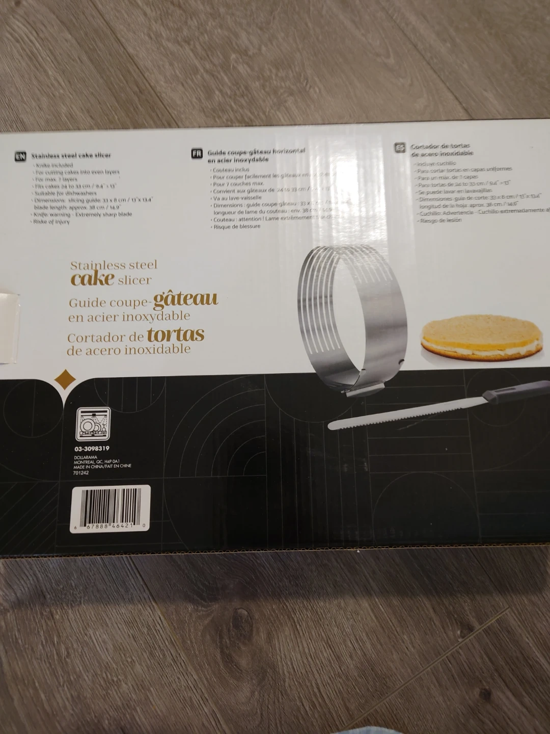Stainless steel cake slicer and horizontal cake layerer. Fits cakes up to 10" / 25.4 cm. Blade length approx. 13" / 33 cm. Makes cutting even layers easy!