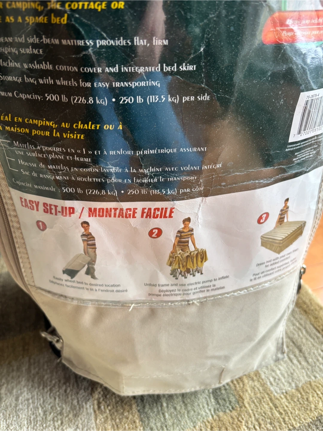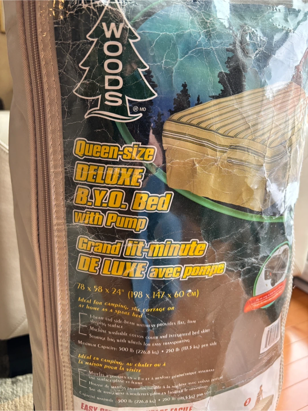 This Woods Queen Deluxe is designed for camping or as a spare bed at home. It also includes a storage bag with wheels for easy transport. Supportive up to 500 lbs. Does NOT include the pump and reflected in low asking price. It measures 78 x 58 x 24 inch’s. In good condition and clean.