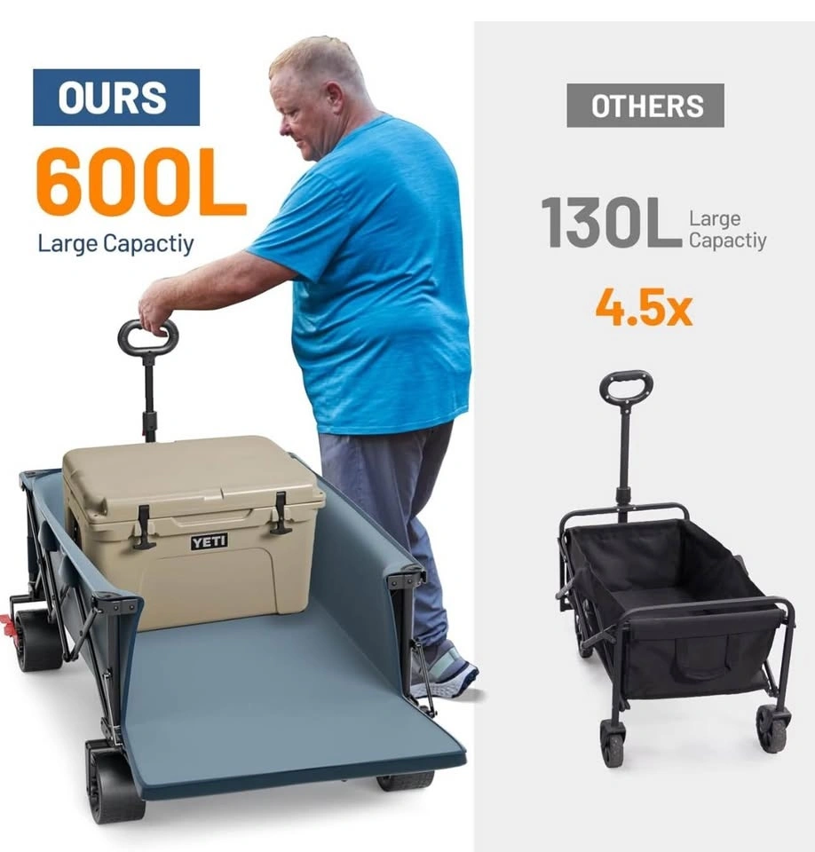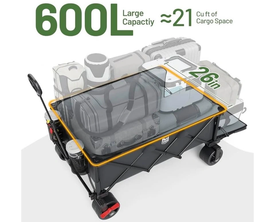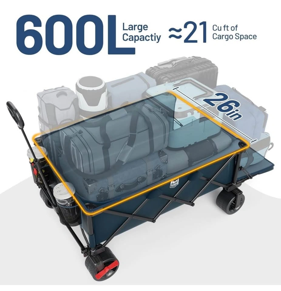 Brand new TIMBER RIDGE 600L Beast Wagon – Extra Wide & Heavy Duty! This wagon features a 26” Extra Wide design and is 55.25” Long with a huge 600L capacity. It supports up to 500 lbs and has big all-terrain wheels that work smoothly on grass, sand & gravel. It's folding and collapsible for easy storage and includes a cargo net & tailgate. Perfect for camping, sports, gardening, beach trips & pets.